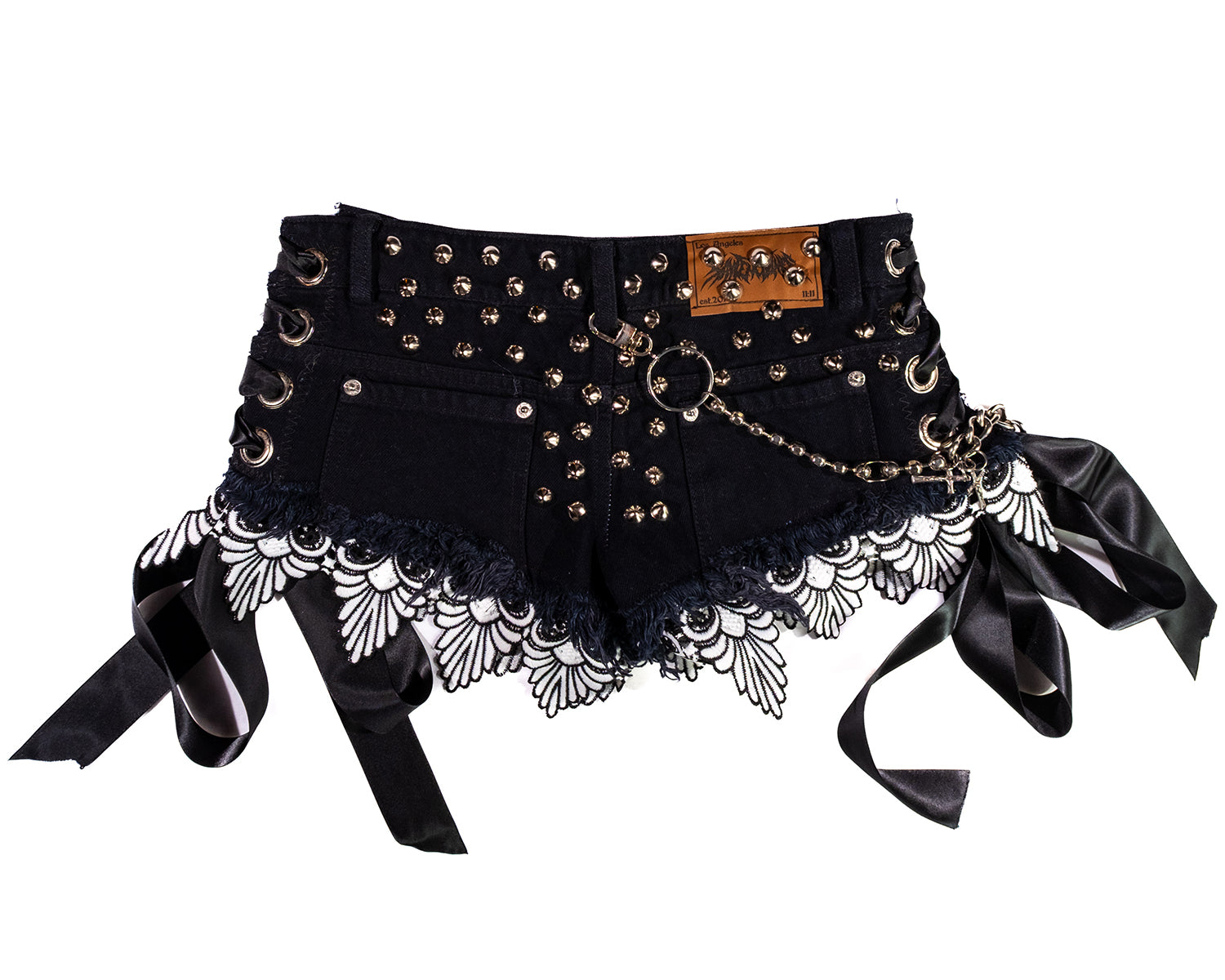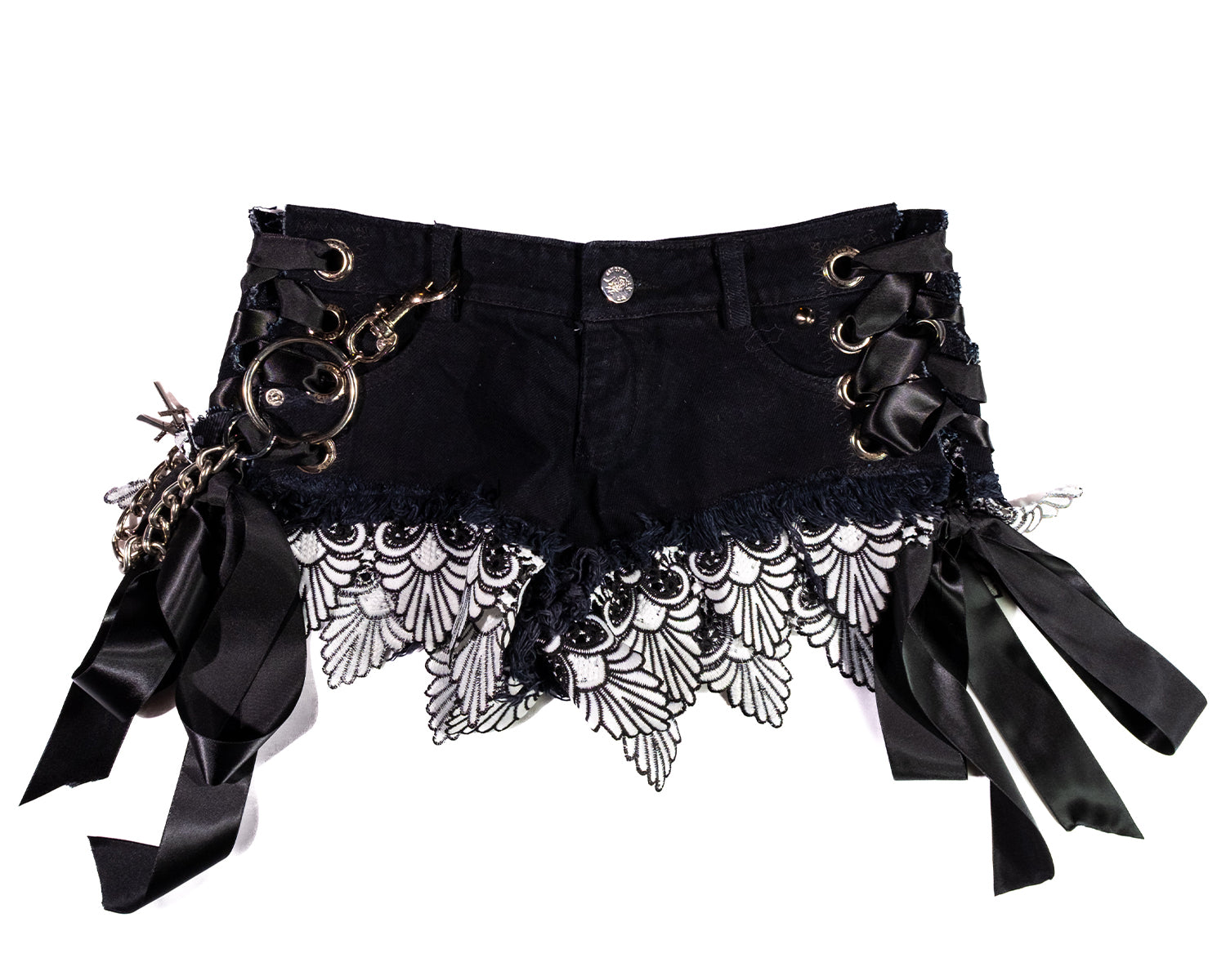 Black jean shorts, Distressed wear and tear, black silk ribbon on both sides of shorts, silver eyelets. Silver Studs on front and back, black&white Crome lace around both legs. Silver chains wrapped around front to back. Jesus peace,