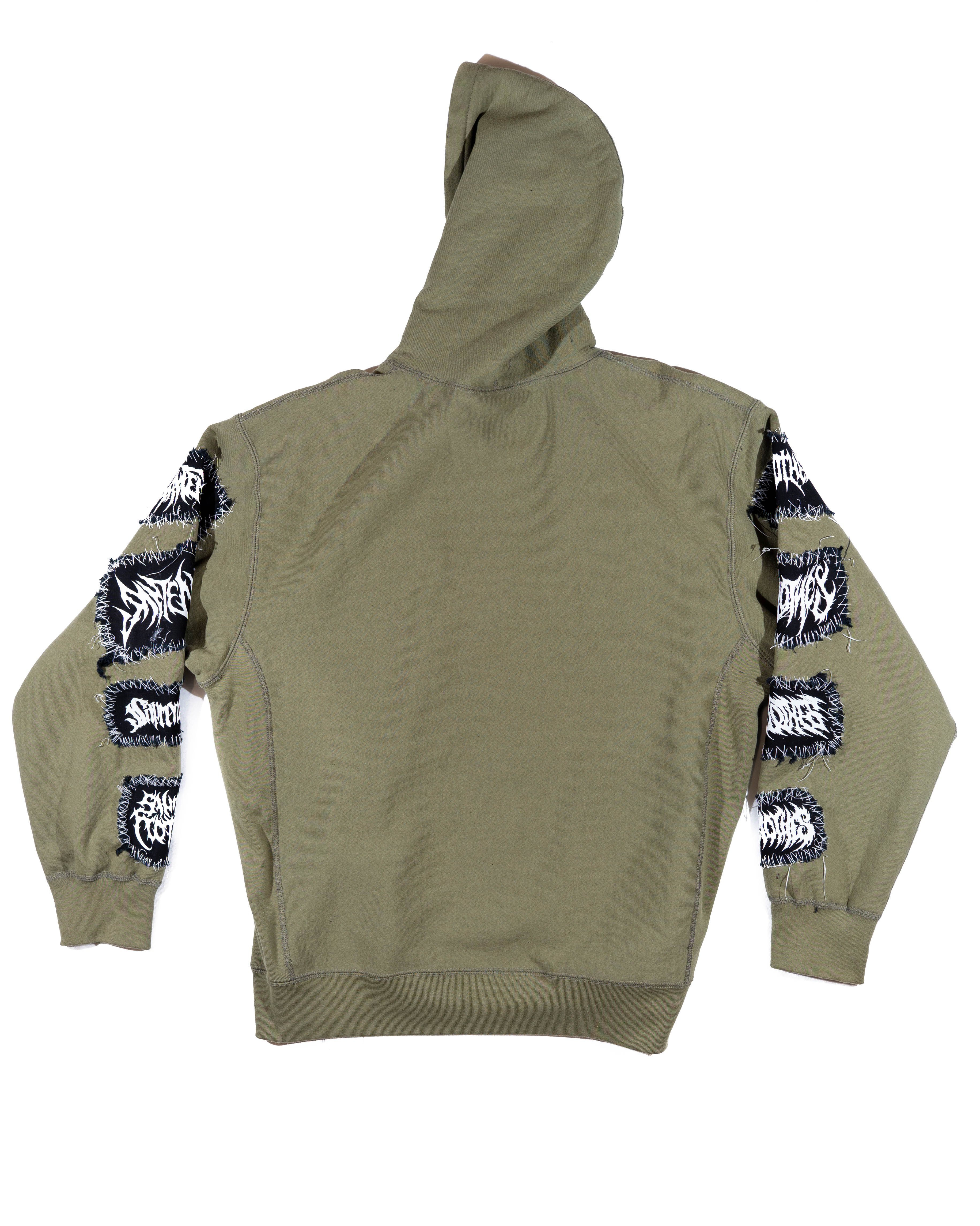 One of a Kind Olive Green Hoodie, SIZE X-LARGE. Made from 100% cotton, Screen print of SAYTEN on the front with hand sewn patches on the sleeves.