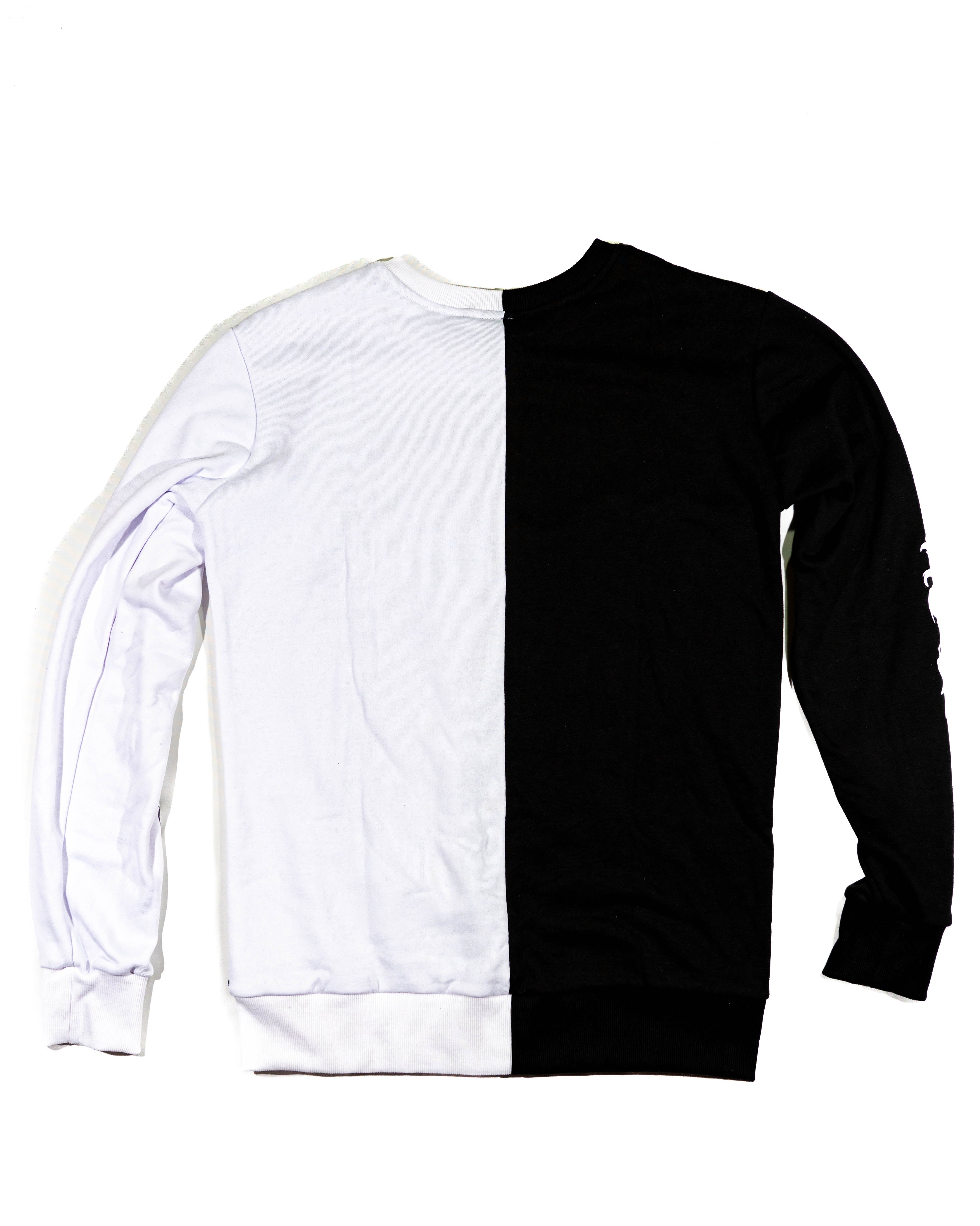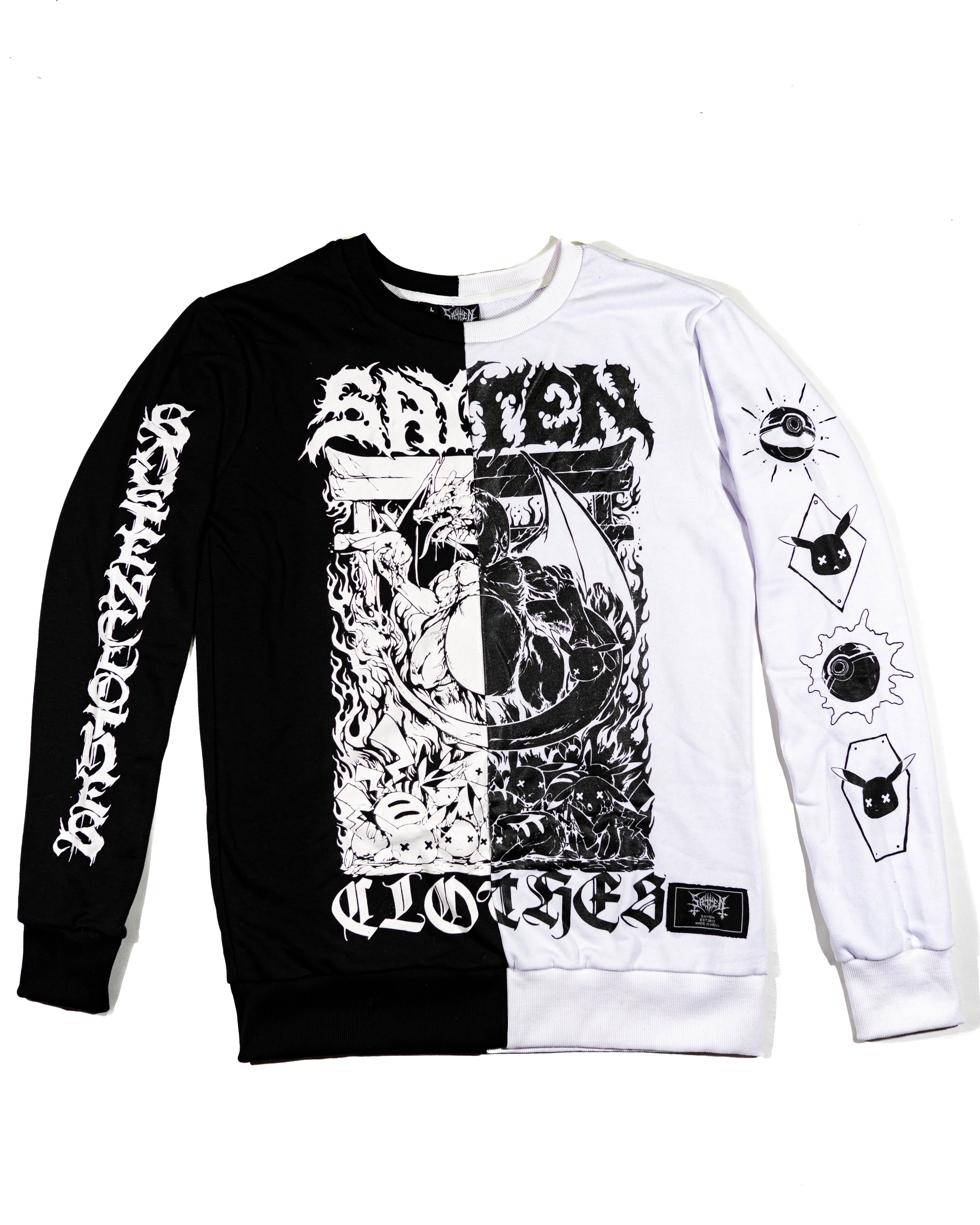 BLVCK and WHITE Long Sleeve with crew neck with charizard destroying a bunch of pikachu's. right arm has Pokemon designs, left are has SAYTENCLOTHES running down the sleeve. Tags at the bottom of garment and on the inside of the collar.