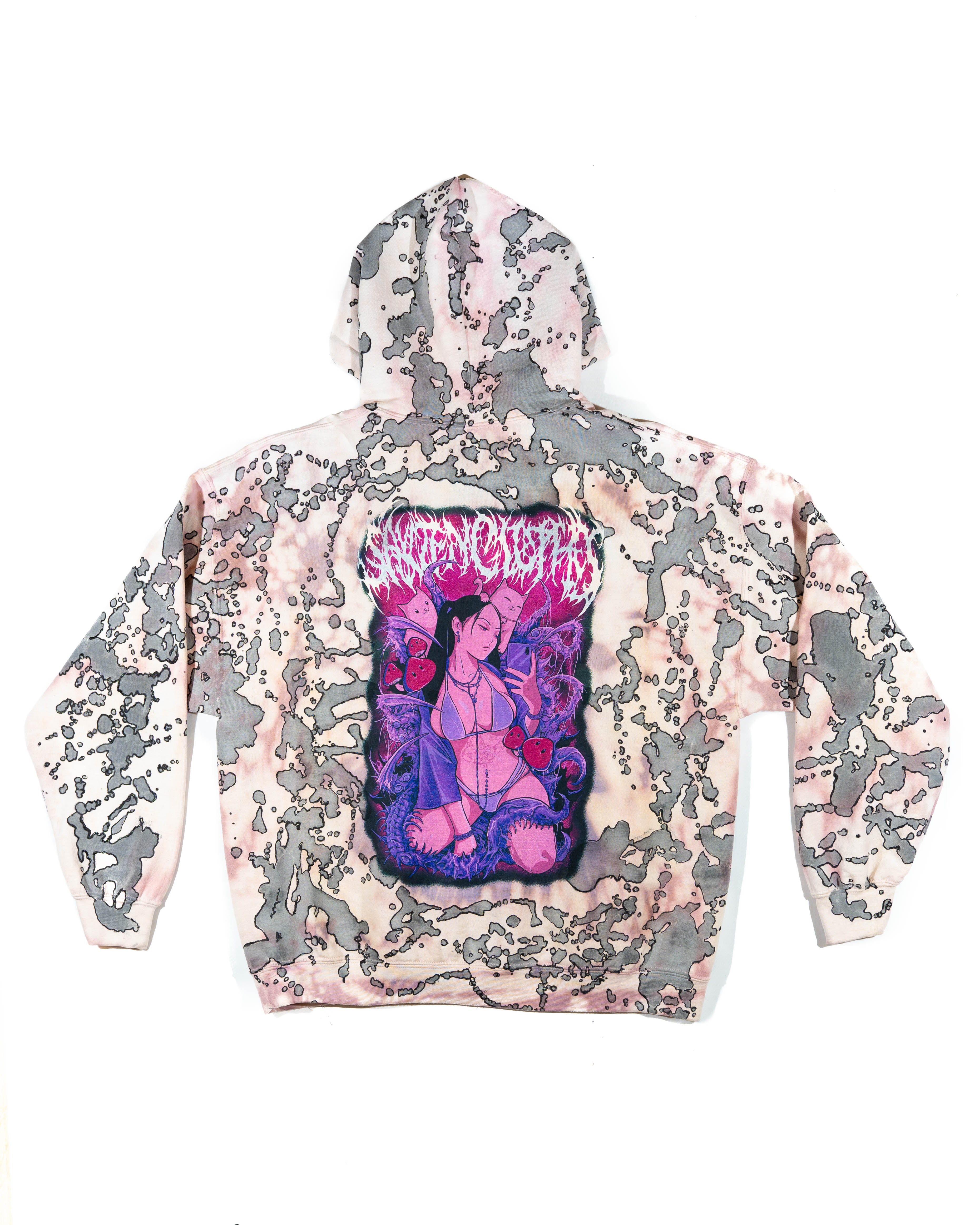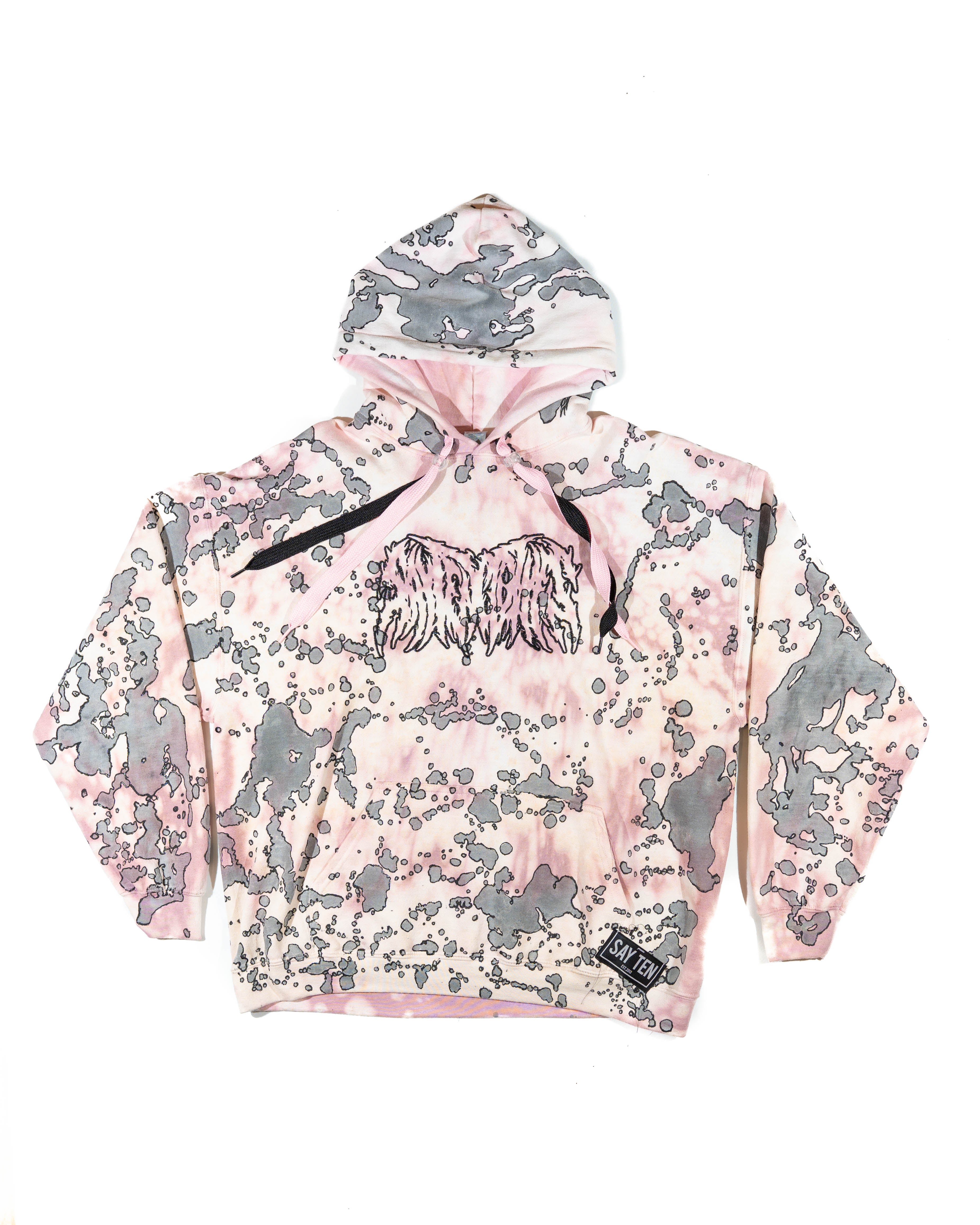One of a kind bleach tie-die Ink splattered hoodie, SIZE X-LARGE. Made from 100% cotton, embroidered SAYTEN on the front.