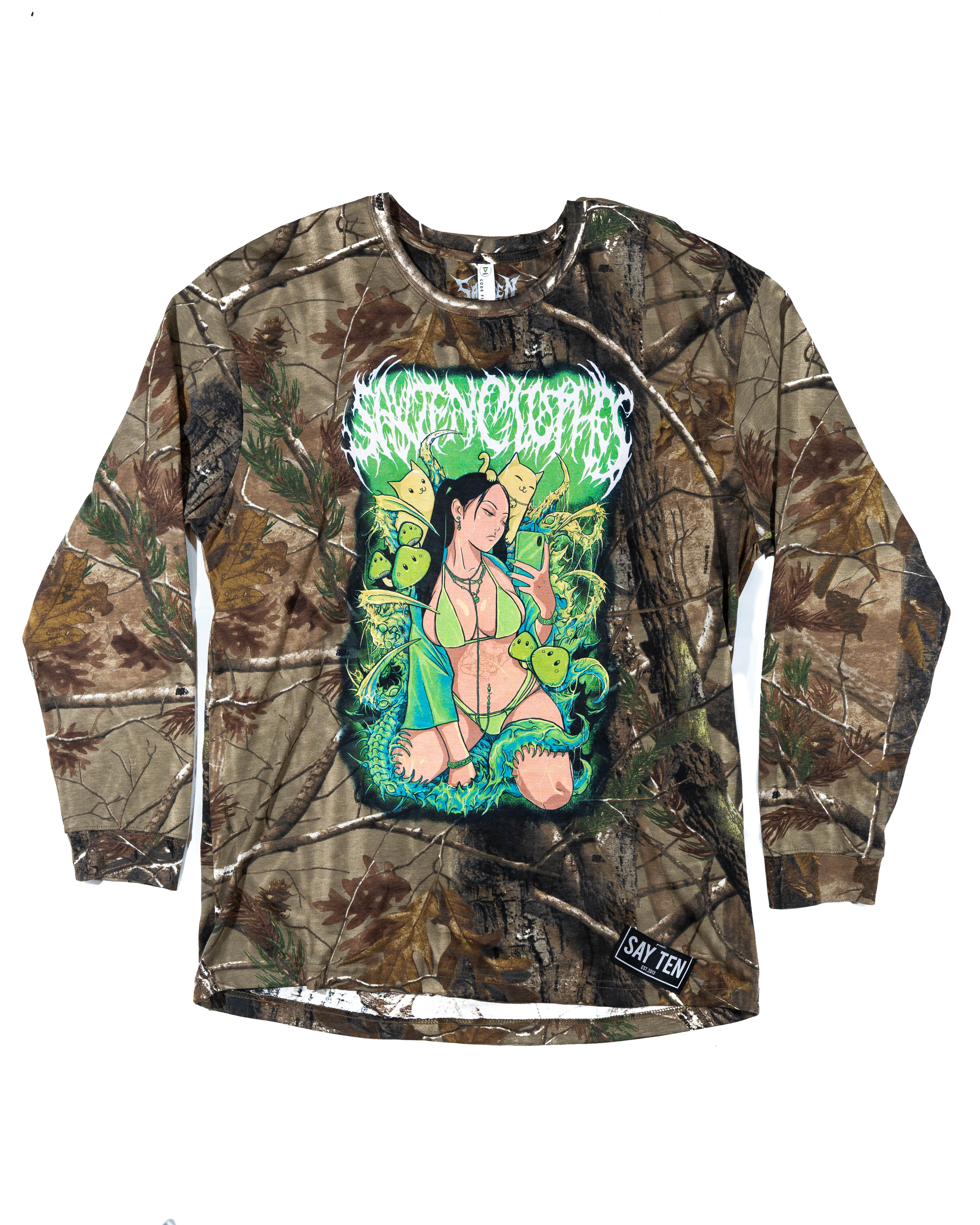 Two-off shirt, SIZE X-LARGE, real tree long sleeve. Made from 100% cotton, Direct to garment print of SAYTEN slime green colored anime girl on front of shirt. Screen printed tag on inside and screen print SAYTEN logo on the back. Only 2 shirts like this in existence with sewn in SAYTEN tag at the bottom.
