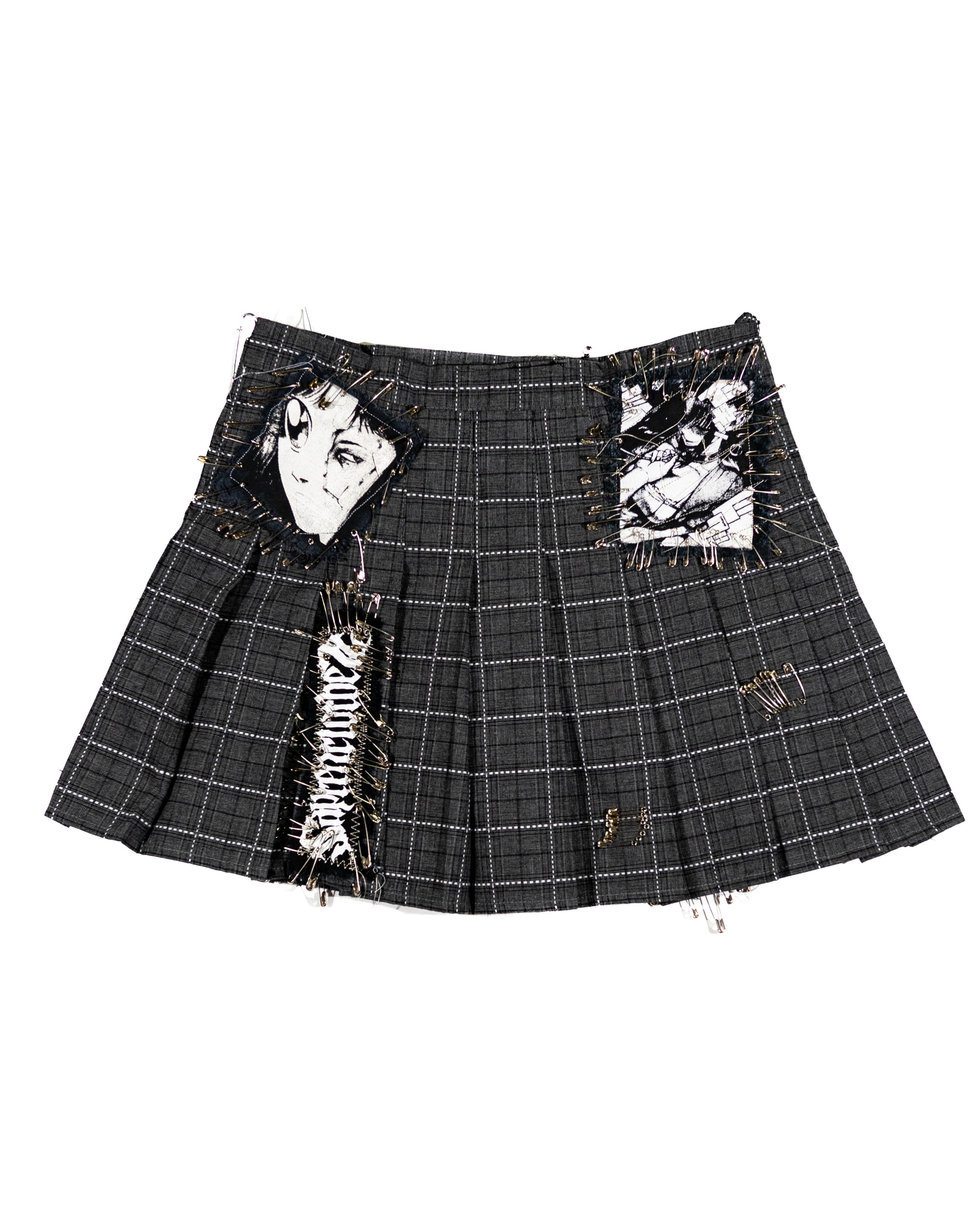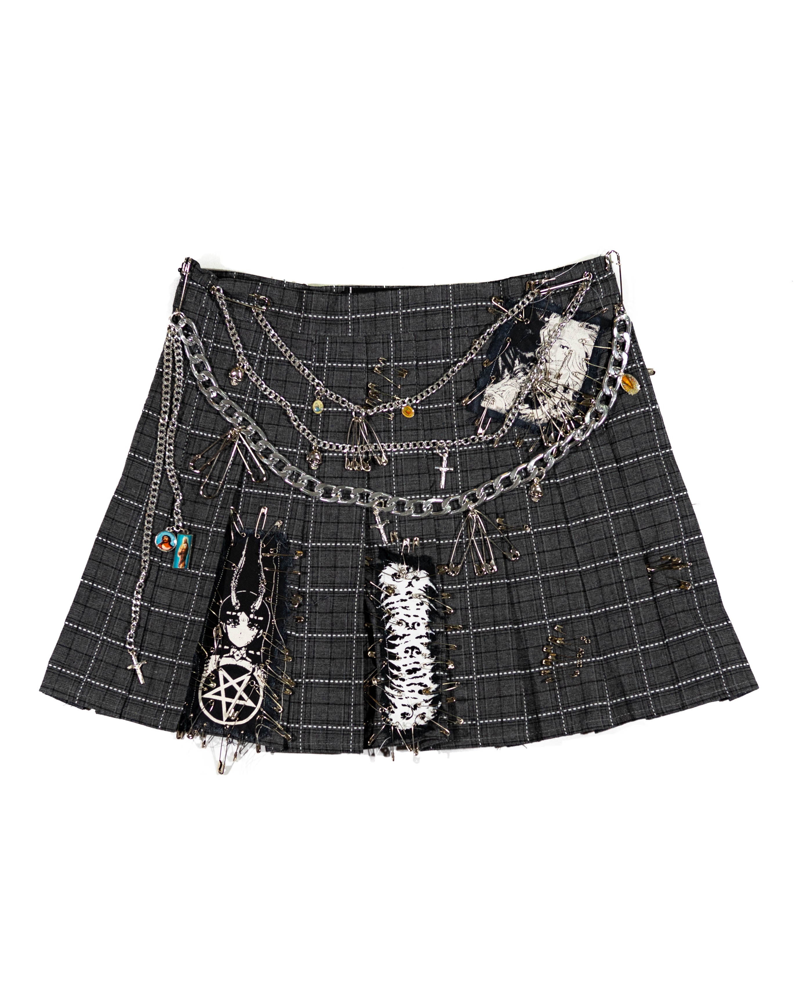 Charcoal plaid pleated skirt, with two SAYTENCLOTHES patches. Four ANIME patches. All patches encompassed with safety pins. Three chains on the front w/ safety pin's, silver skulls, small cross dangles. Two side dangles with jesus pieces. All silver safety pins.