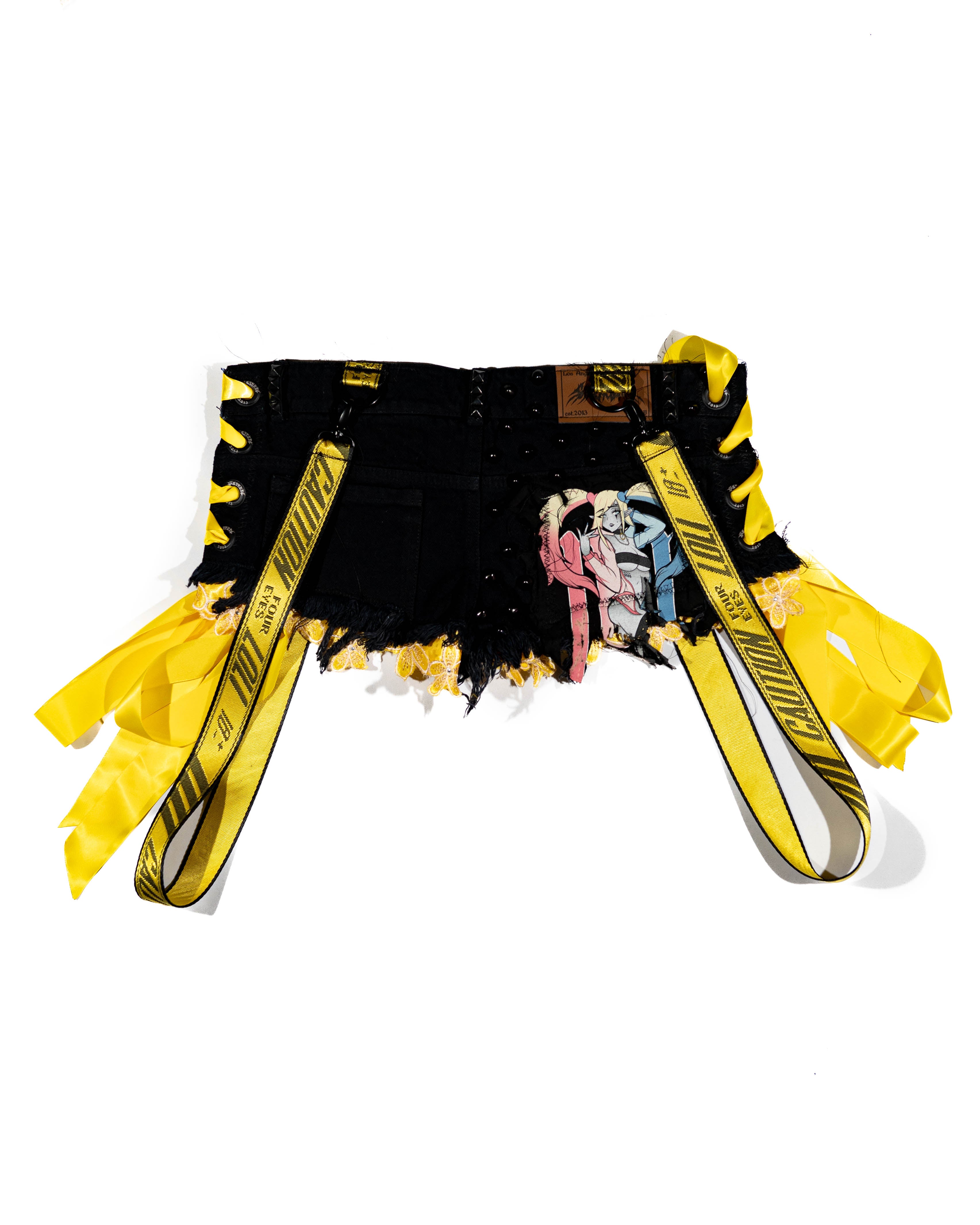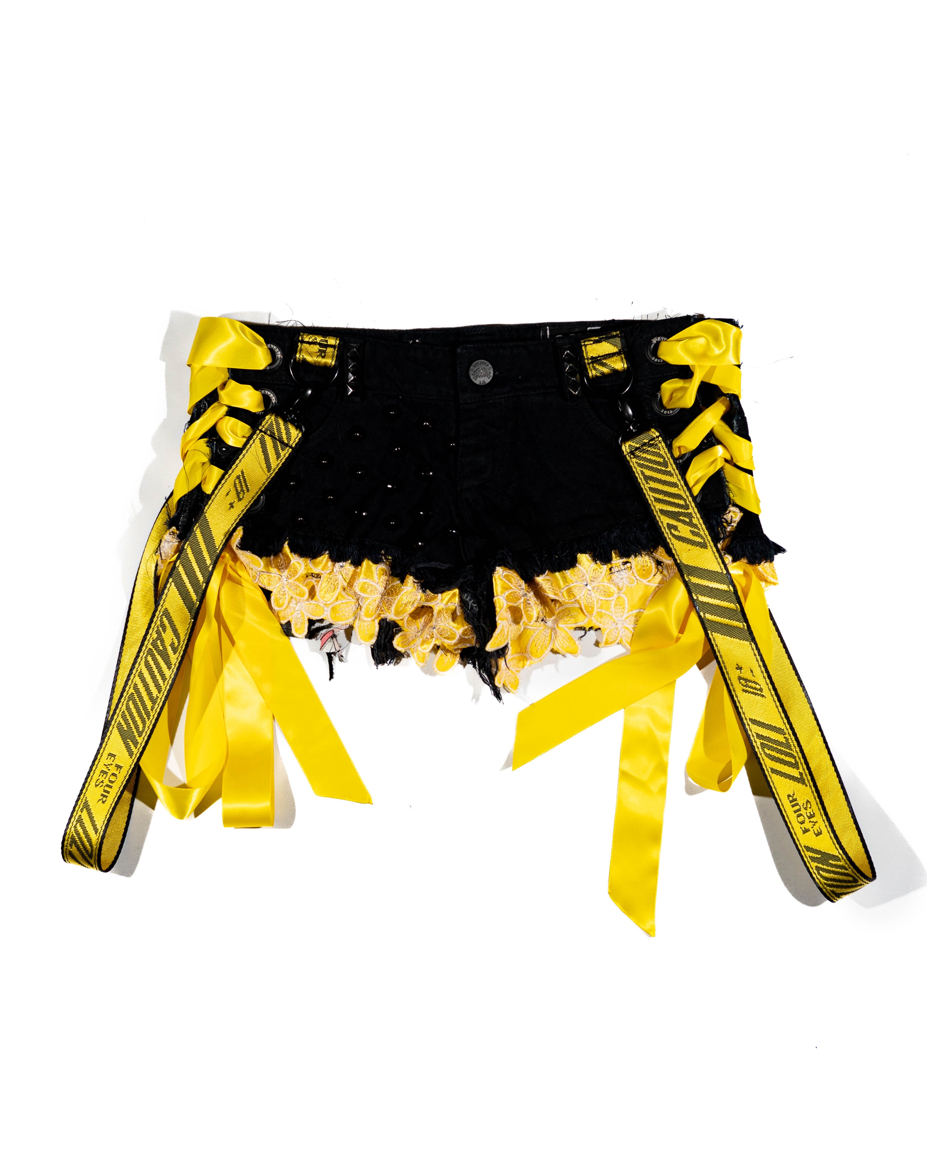 Black jean shorts, Distressed wear and tear, satin yellow lace on both sides of shorts, with SAYTEN silver eyelets. Silver Studs on front and back, Sun daisy flower lace around both legs. Right side 4 iiii"s patch.