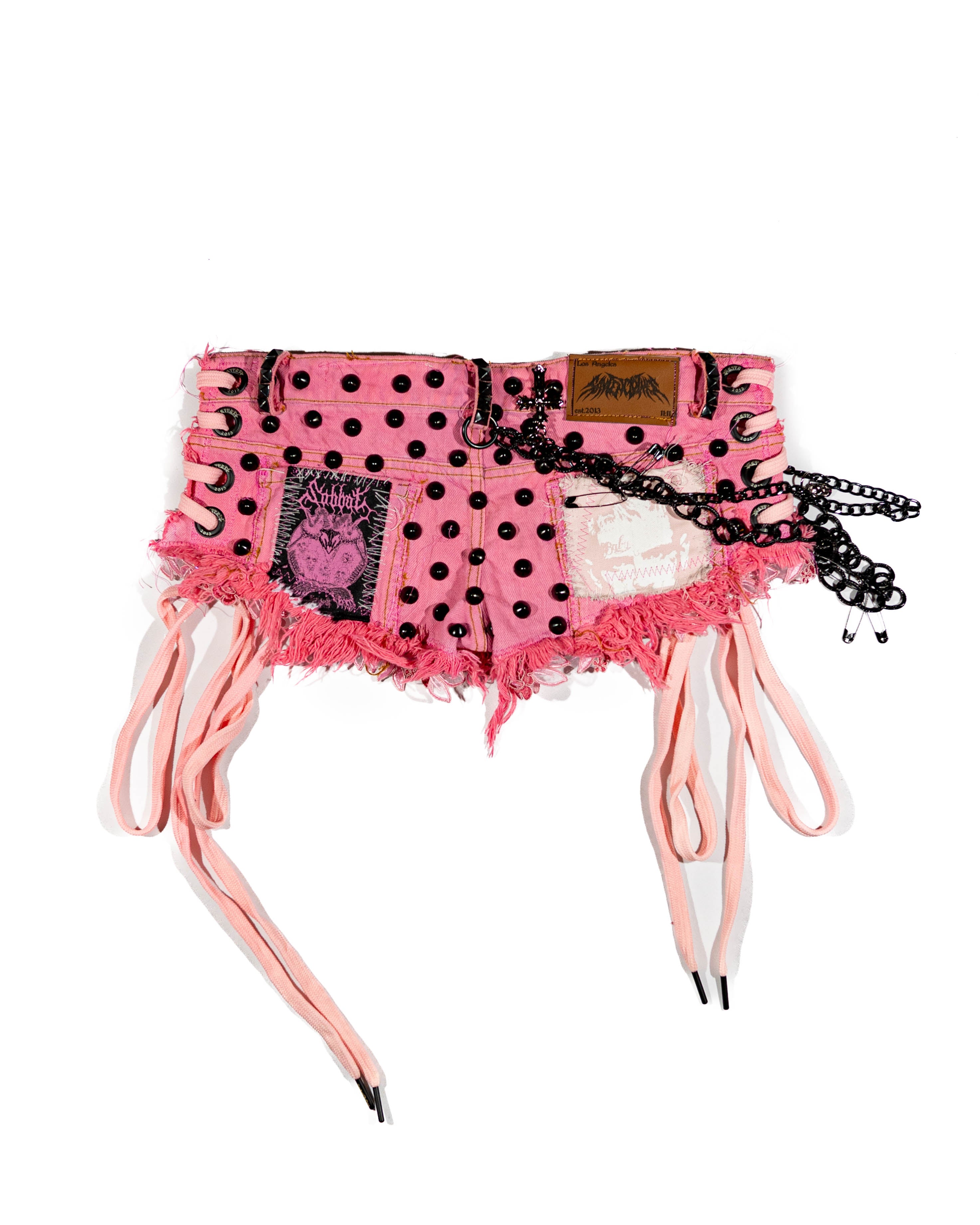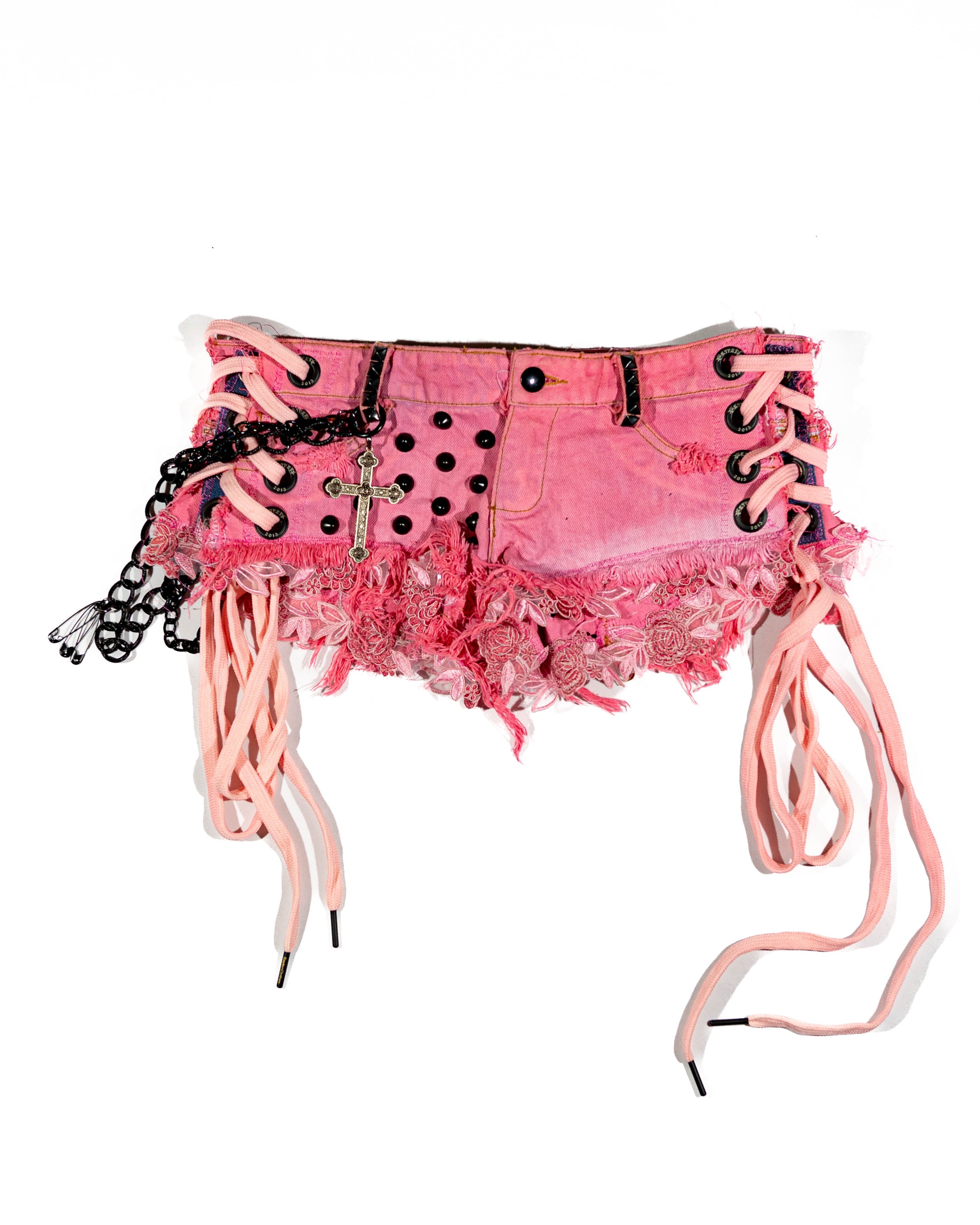 Triple treated PINK denim jean shorts, Distressed wear and tear, Peep pink lace on both sides of shorts, with SAYTEN black eyelets. Black Studs on front and back, pepto bismol pink lace around both legs. Pink metal patch on left pocket, lil peep patch on right side pocket, Two different black chain wrapped around front to back. Big cross on the front, black skull safety pins and small cross's dangles.