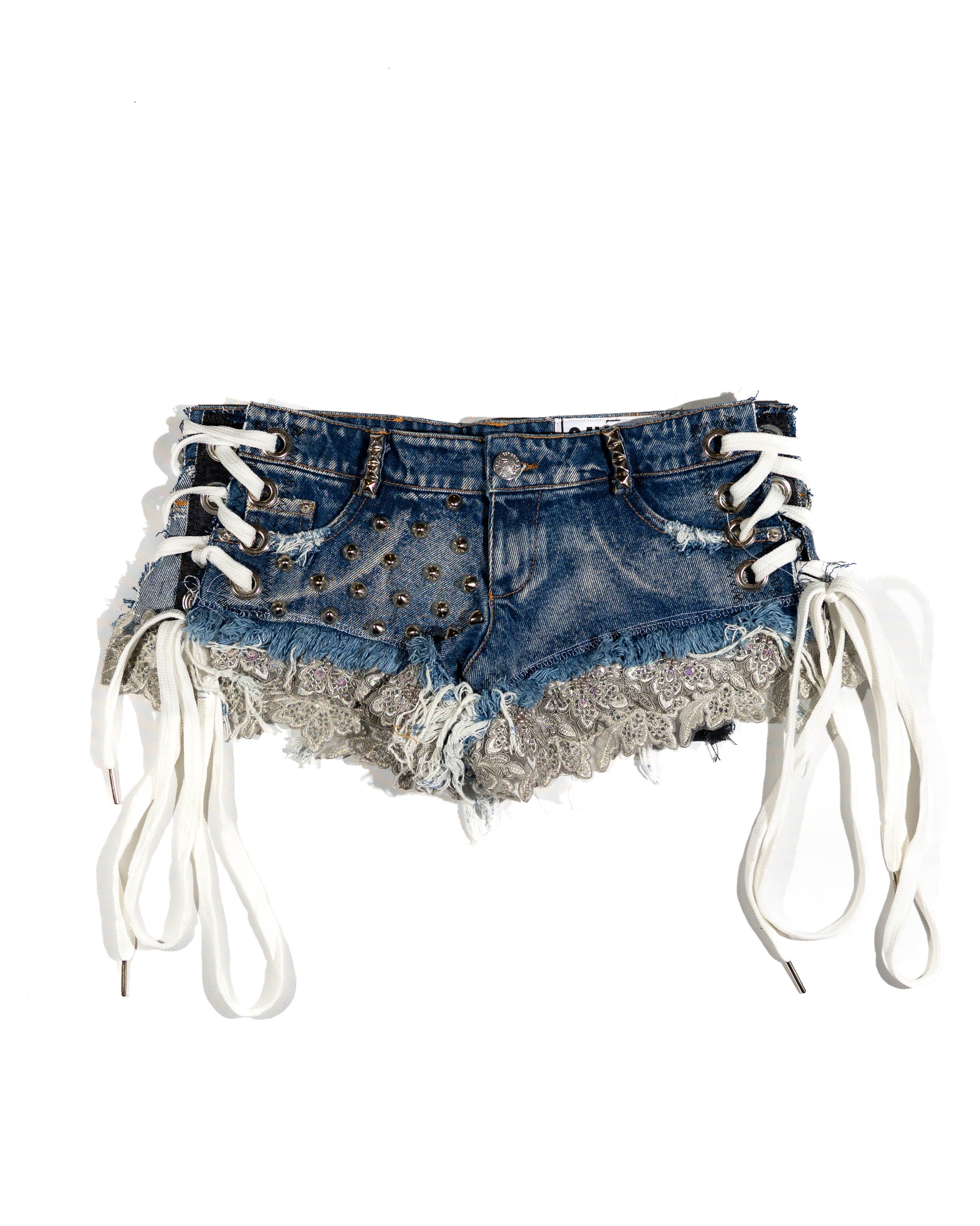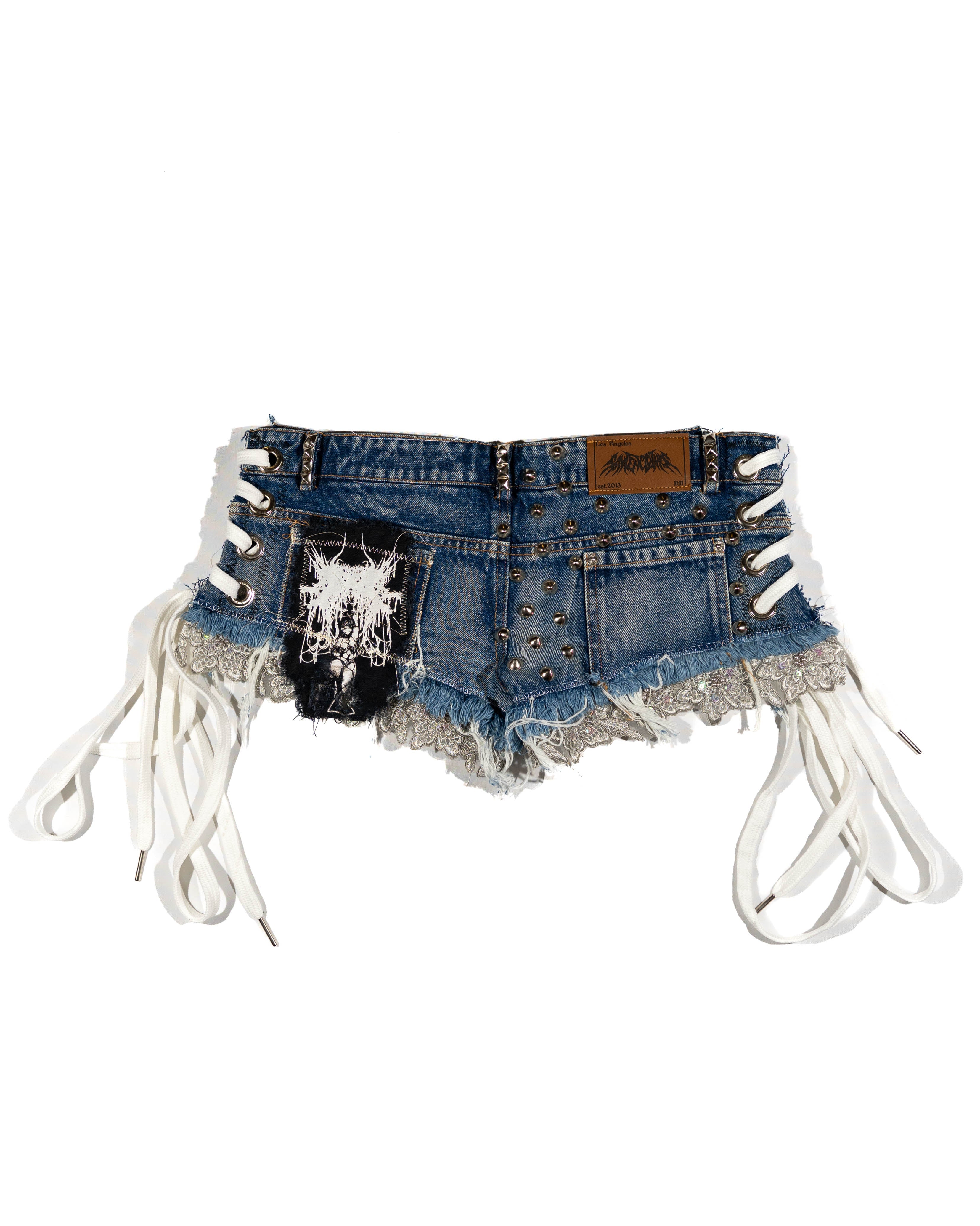 Blue denim shorts, Distressed wear and tear, white lace on both sides of shorts, with SAYTEN silver eyelets. Silver Studs on front and back, metal gray lace around both legs. with a metal patch on the left side.