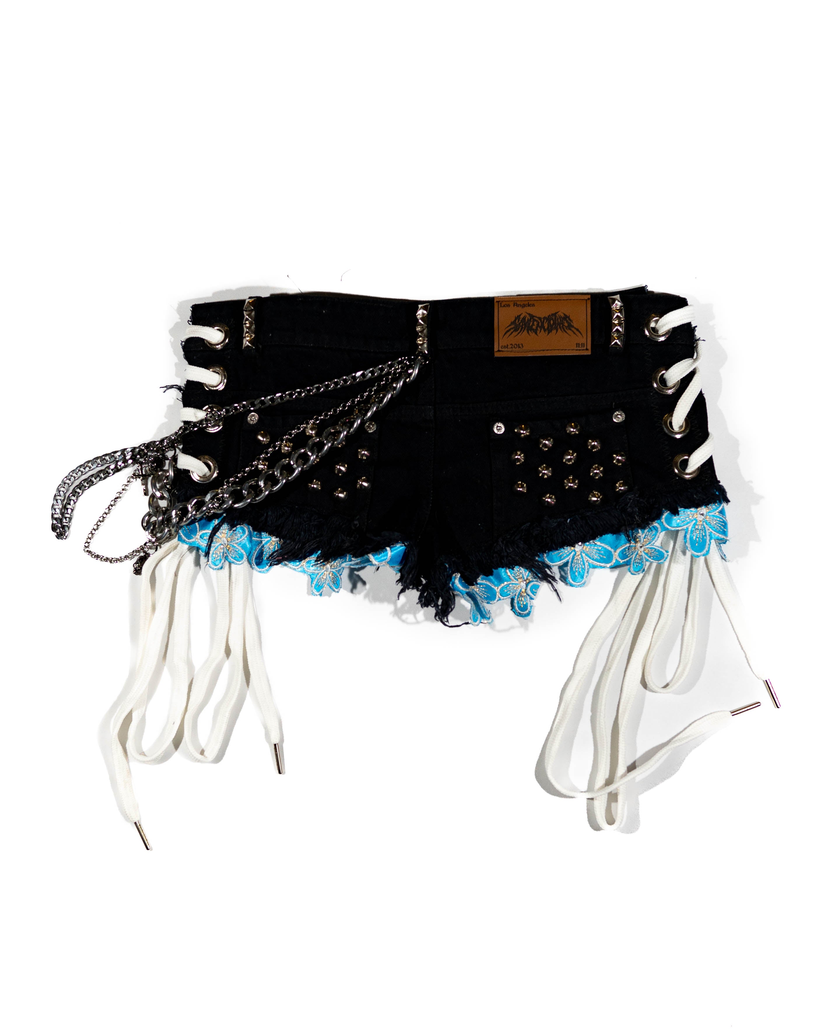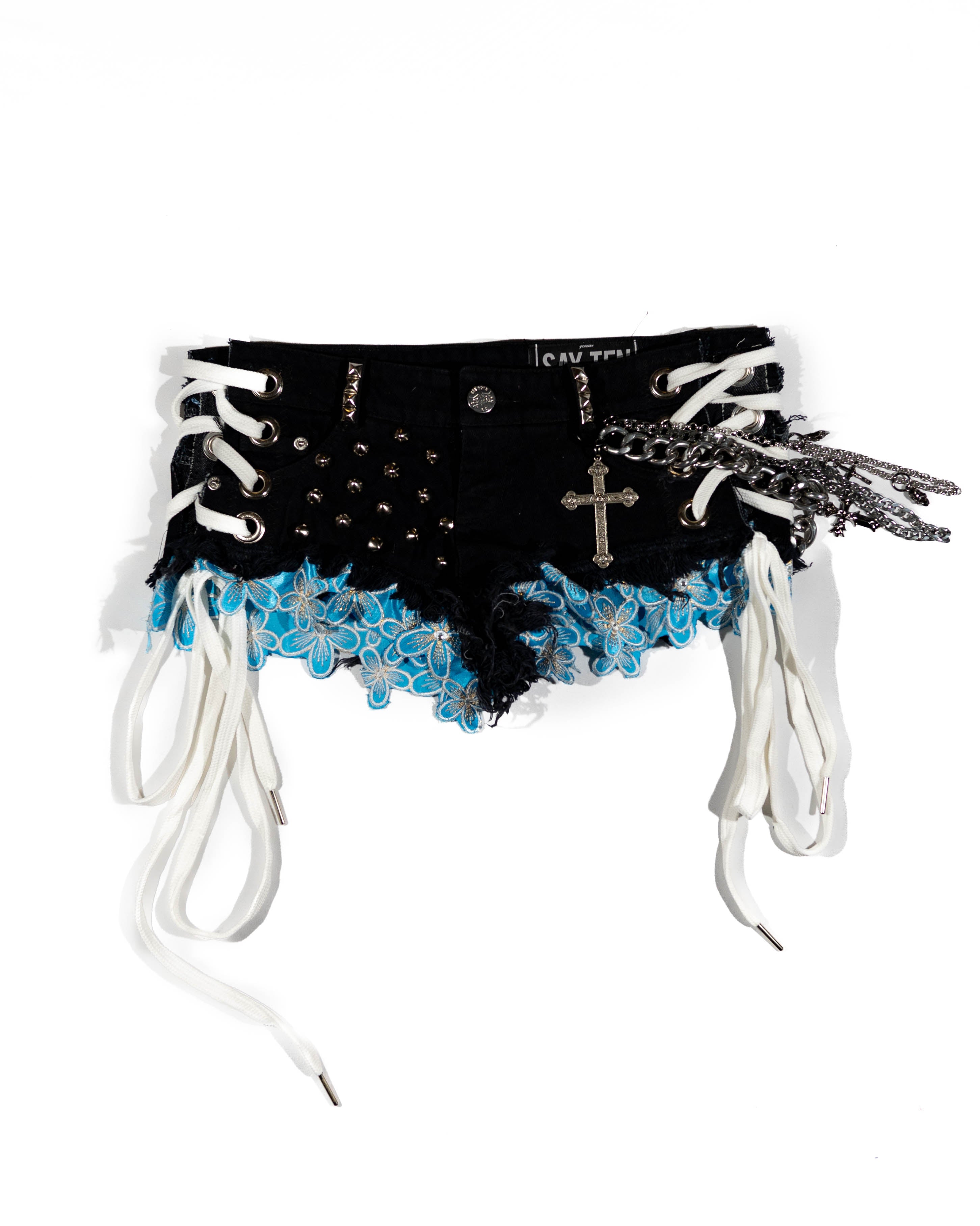 Black jean shorts, Distressed wear and tear, White lace on both sides of, with SAYTEN silver eyelets. Black Studs on front and back, Sky-blue flower lace around both legs. With 3 different silver chain and one silver chain wrapped around front to back. Jesus peace, and silver skull dangles.
