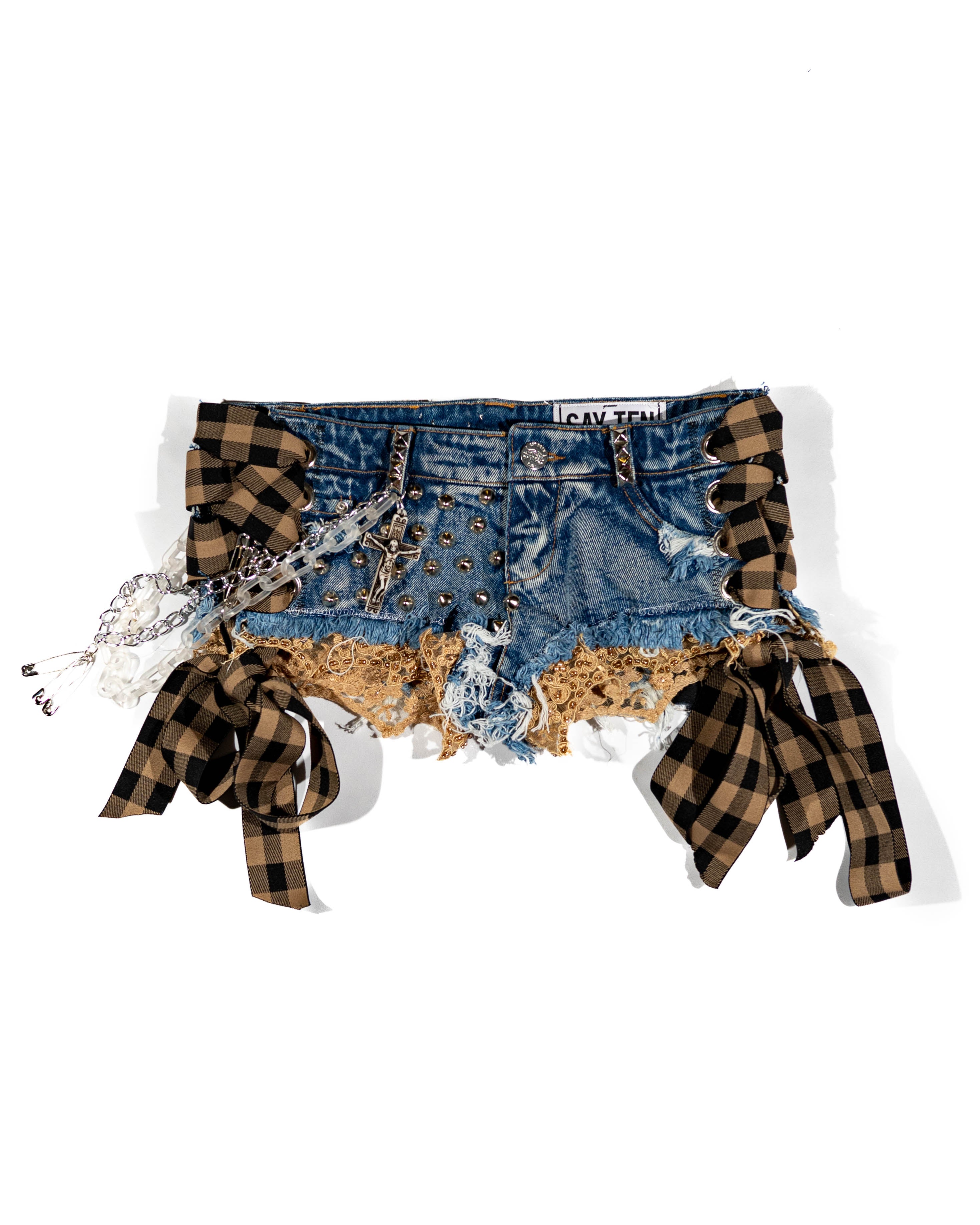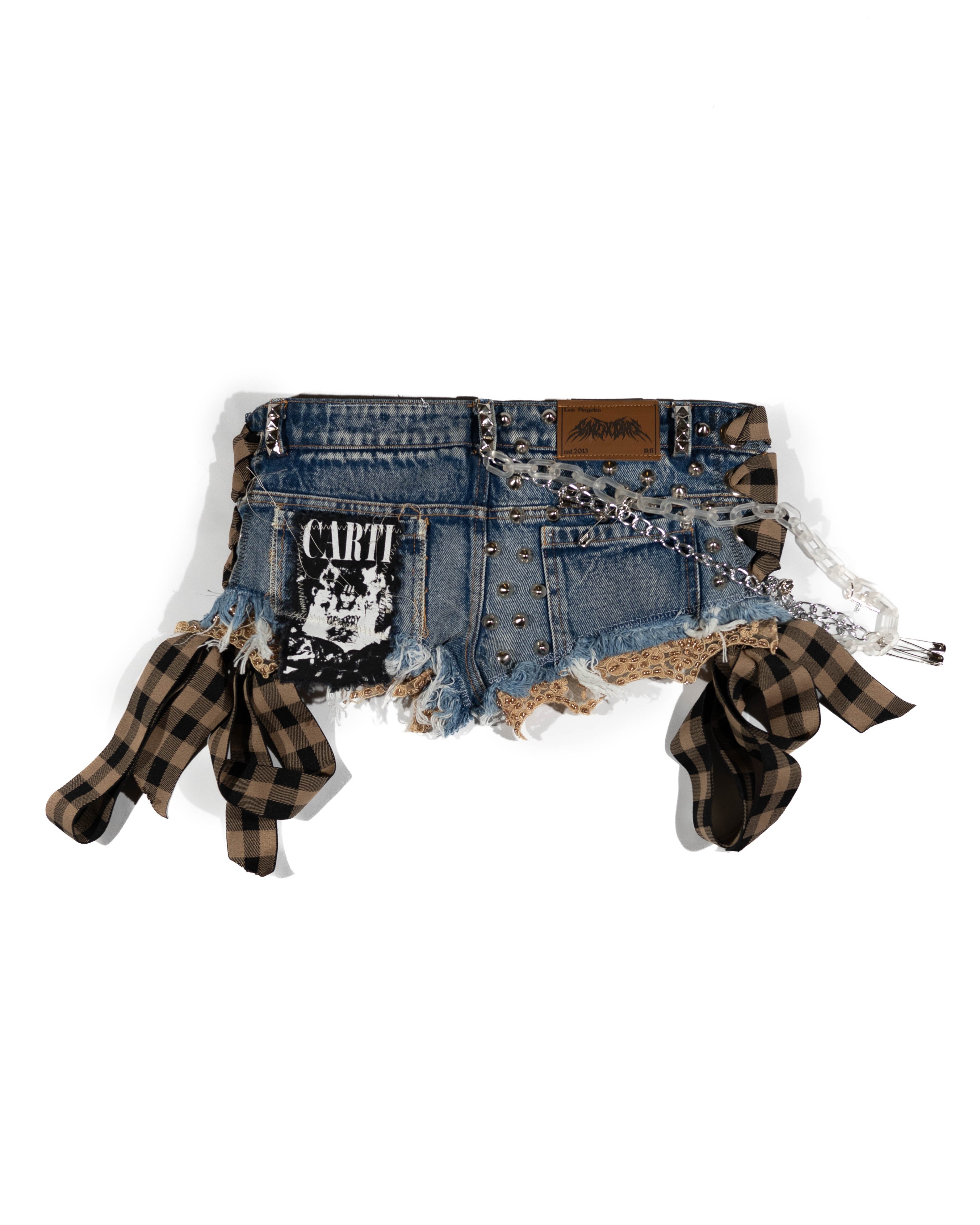 Blue jean shorts, Distressed wear and tear, Tan plaid elastic on both sides of shorts, with SAYTEN silver eyelets. Silver Studs on front and back, dusk tan lace around both legs. CARTI patch on back right with one clear chain and one silver chain wrapped around front to back. Jesus peace, safety pins, and silver skull dangles.