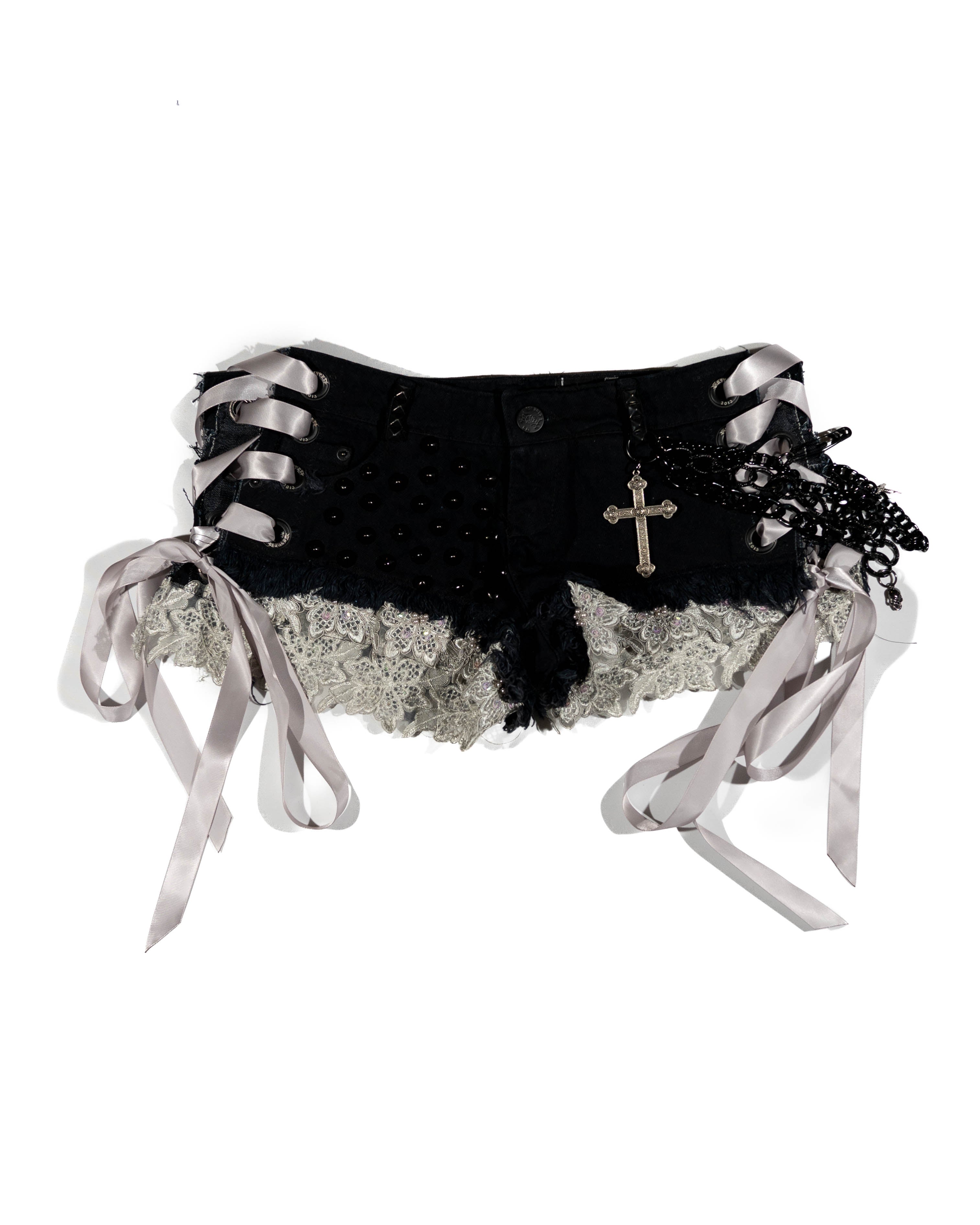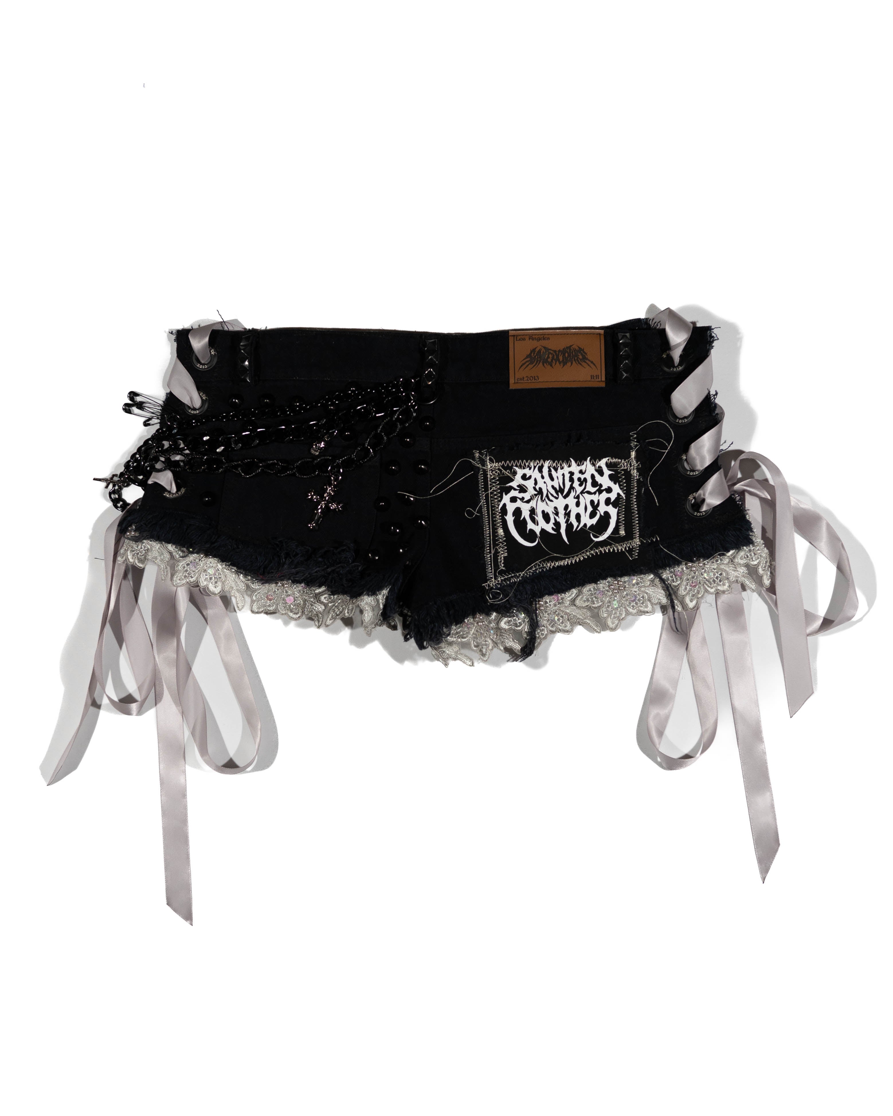 Black jean shorts, Distressed wear and tear, Tesla gray lace on both sides of shorts, with SAYTEN black eyelets. Black Studs on front and back, Tesla gray lace around both legs. with SAYTENCLOTHES patch on the right side pocket. Three different black chain wrapped around front to back. Big cross, safety pin's, black skull, small cross dangles.