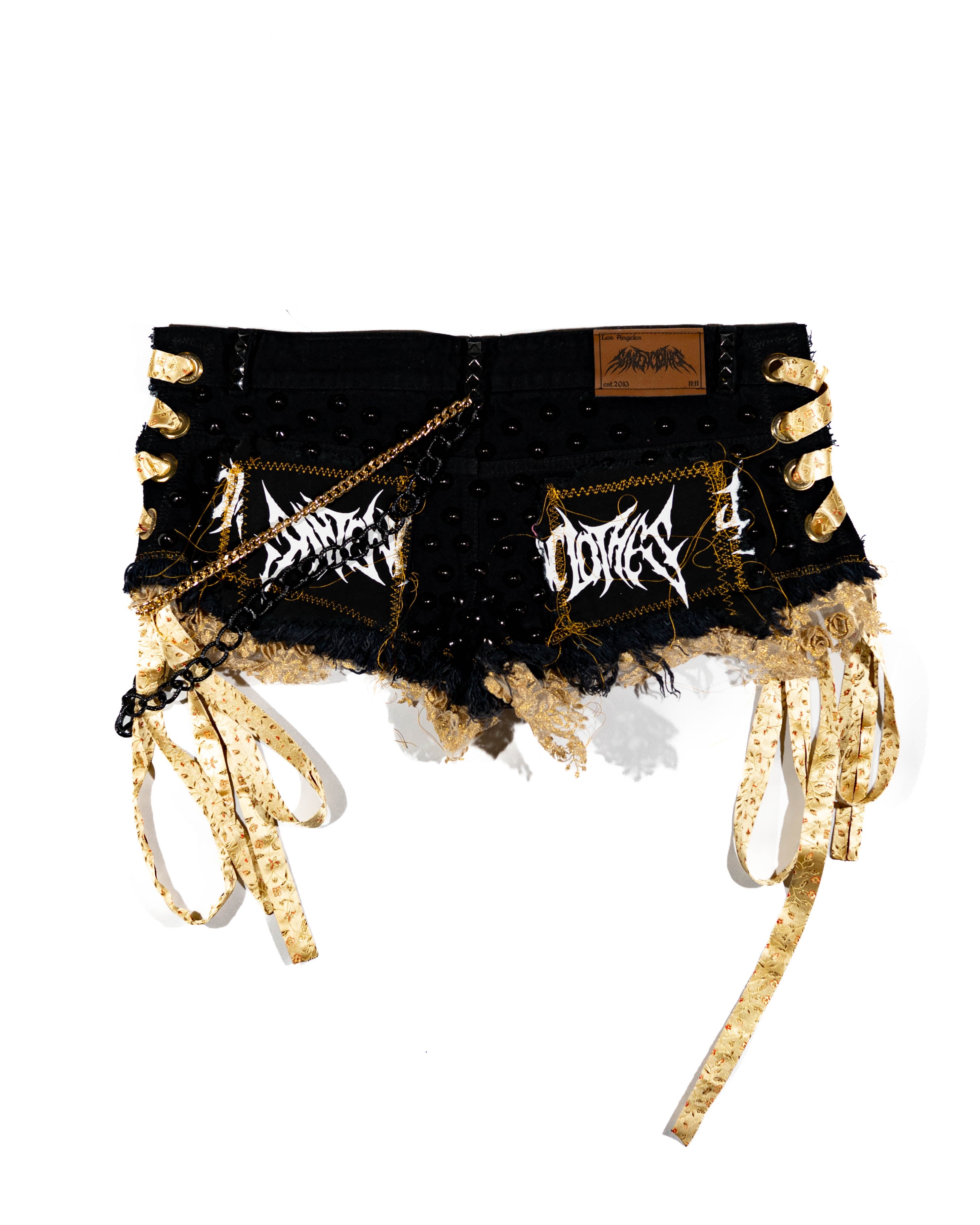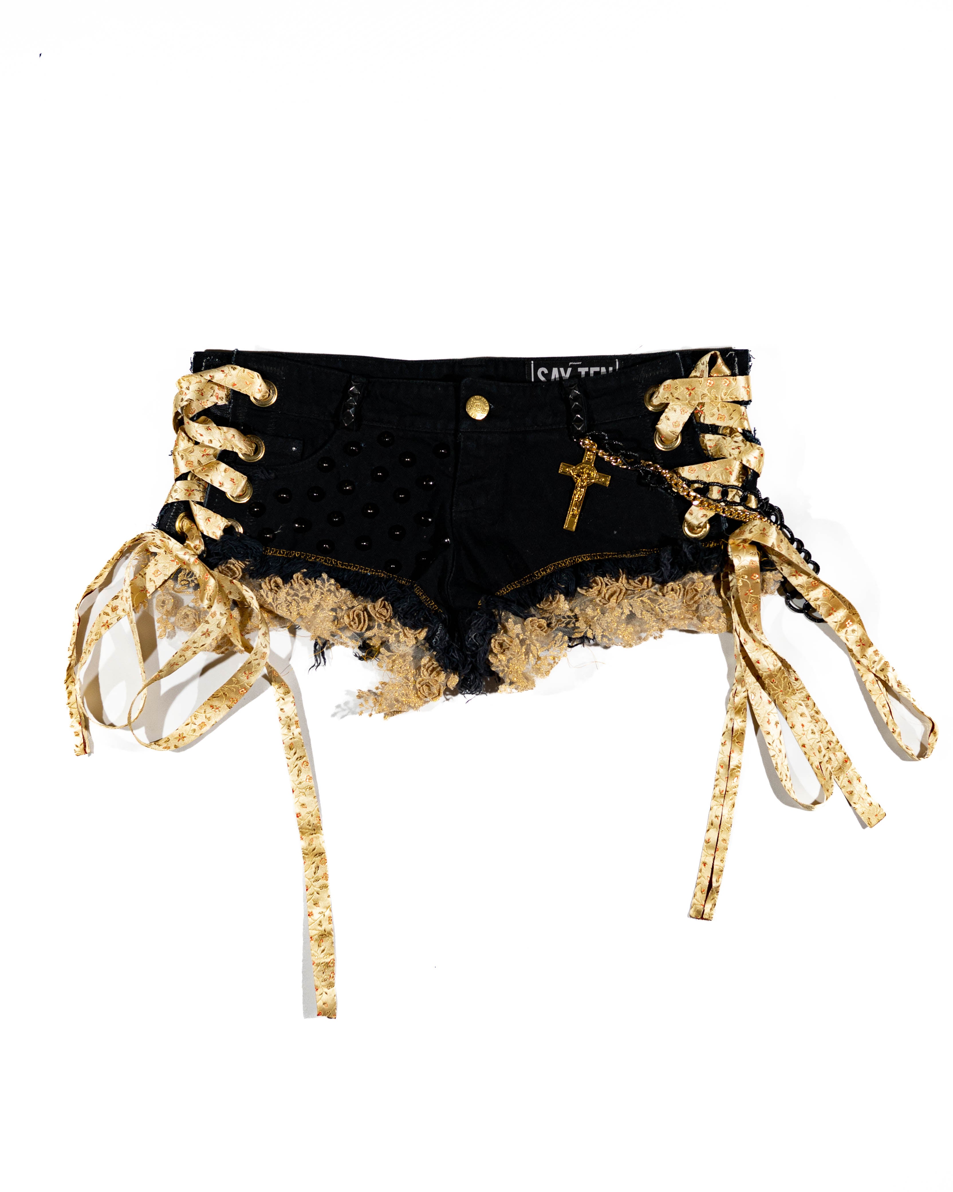 Black jean shorts, Distressed wear and tear, Gold girl ribbon on both sides of shorts, with SAYTEN Gold eyelets. Black Studs on front and back, Baby gold lace around both legs. with SAYTENCLOTHES patch across both pockets. Two different chains black and gold, wrapped around front to back. Big gold cross dangles.