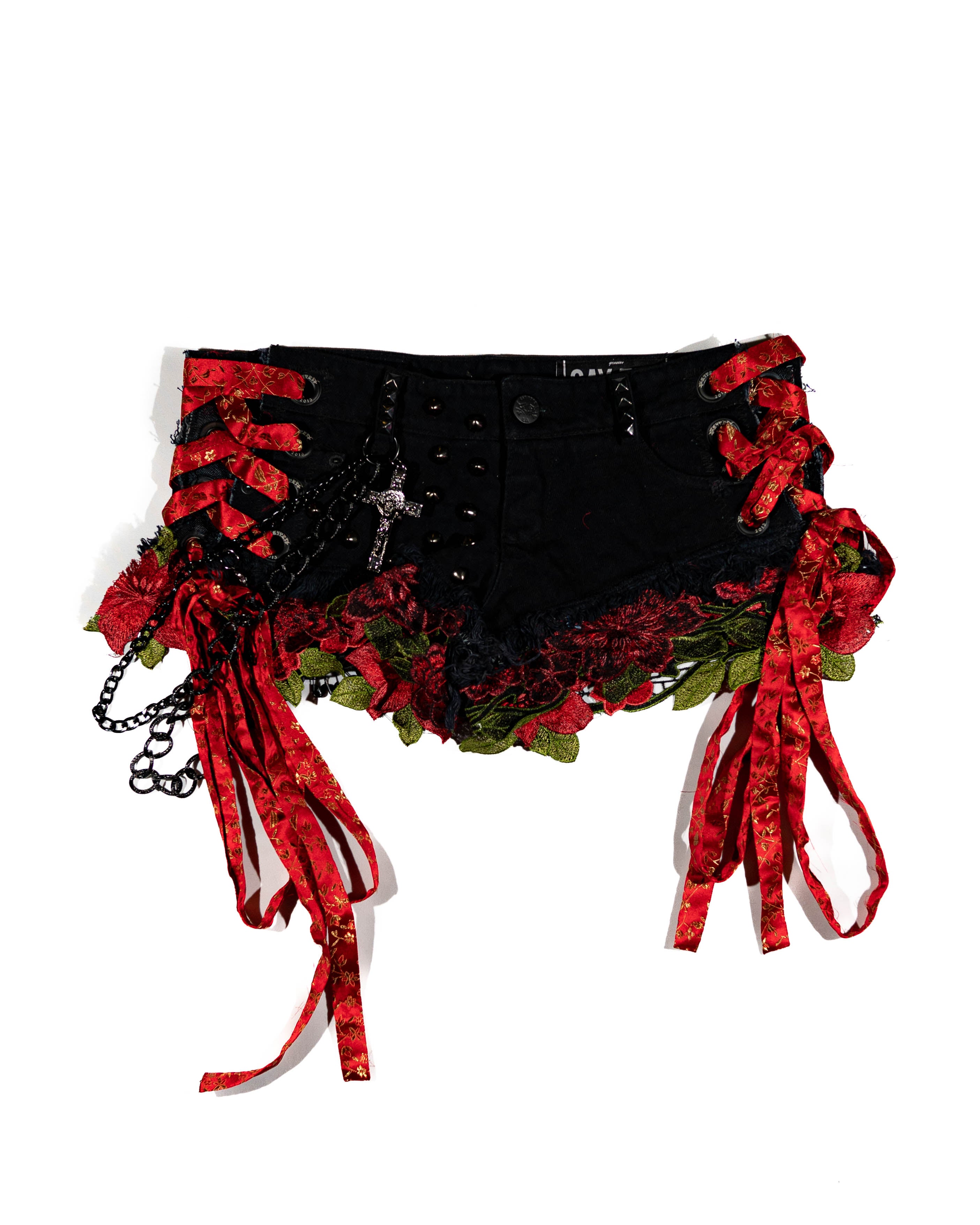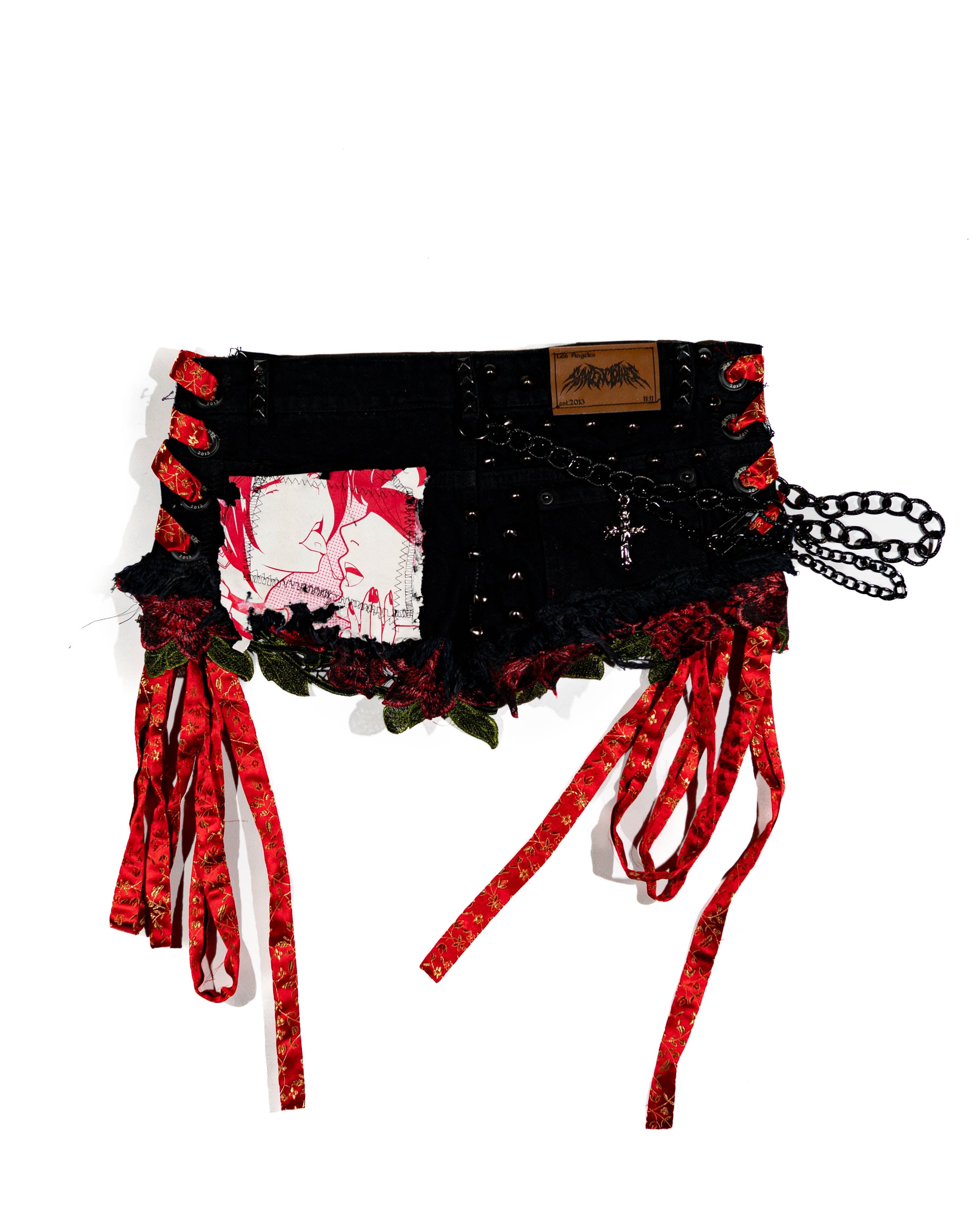 Black jean shorts, Distressed wear and tear, Ruby red floral ribbon on both sides of shorts, with SAYTEN black eyelets. Black Studs on front and back,Blood red floral lace around both legs and left side iiii"s pocket patch. Two different black chain wrapped around front to back. Big cross on the front, black skull and small cross's dangles.