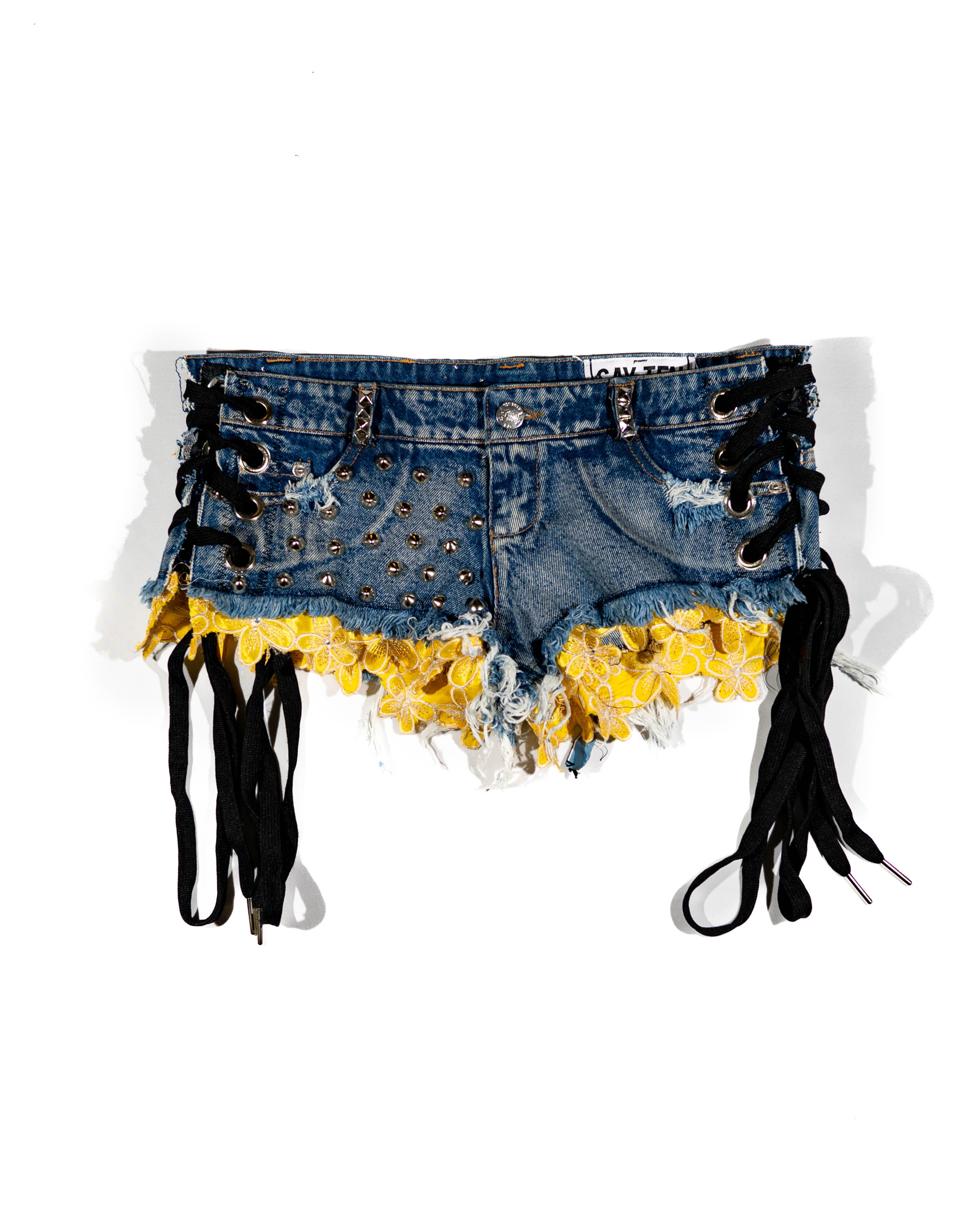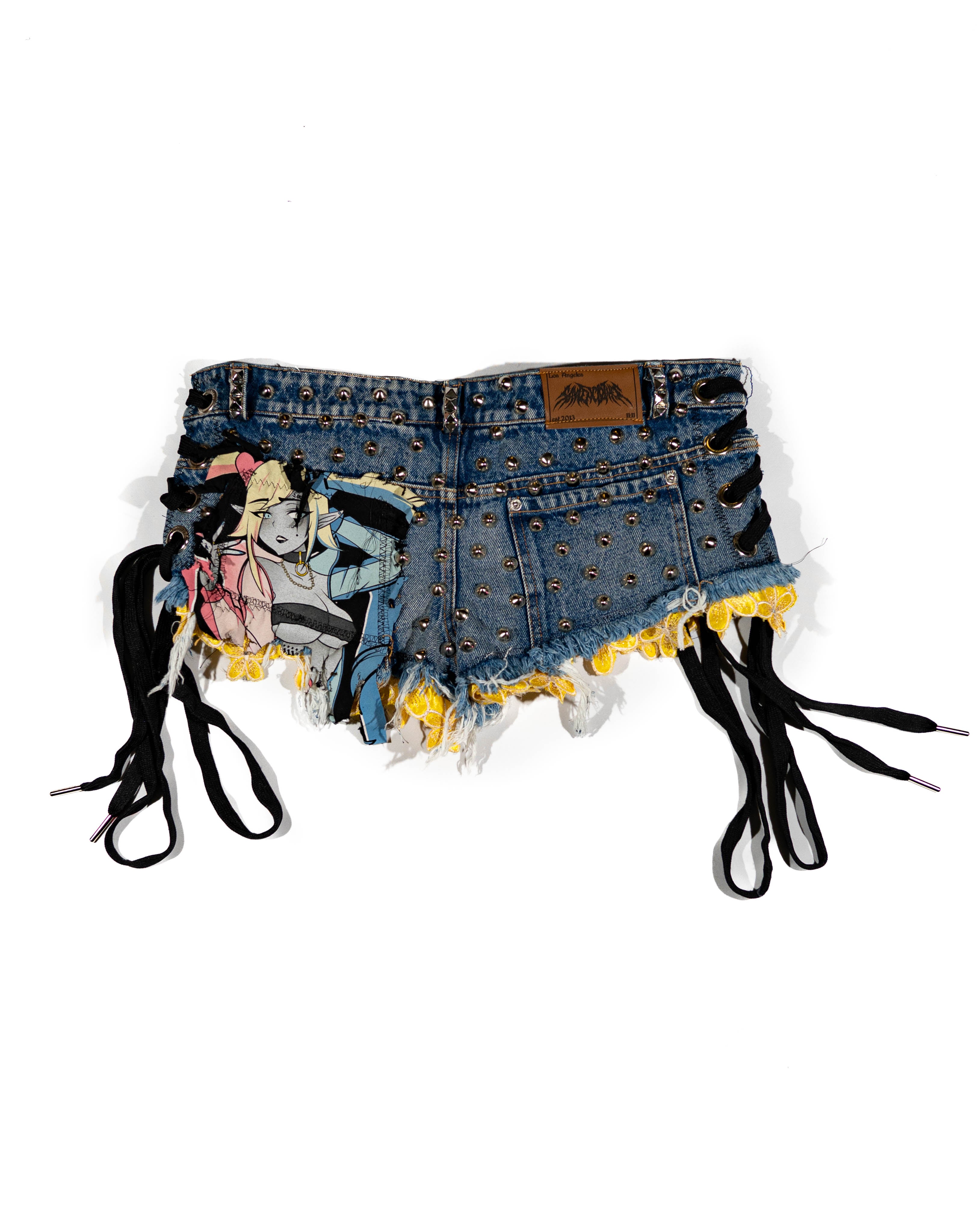 Blue jean shorts, Distressed wear and tear, black lace on both sides of shorts, with SAYTEN silver eyelets. Silver Studs on front and back, Sun daisy flower lace around both legs. Left side 4 iiii"s patch.