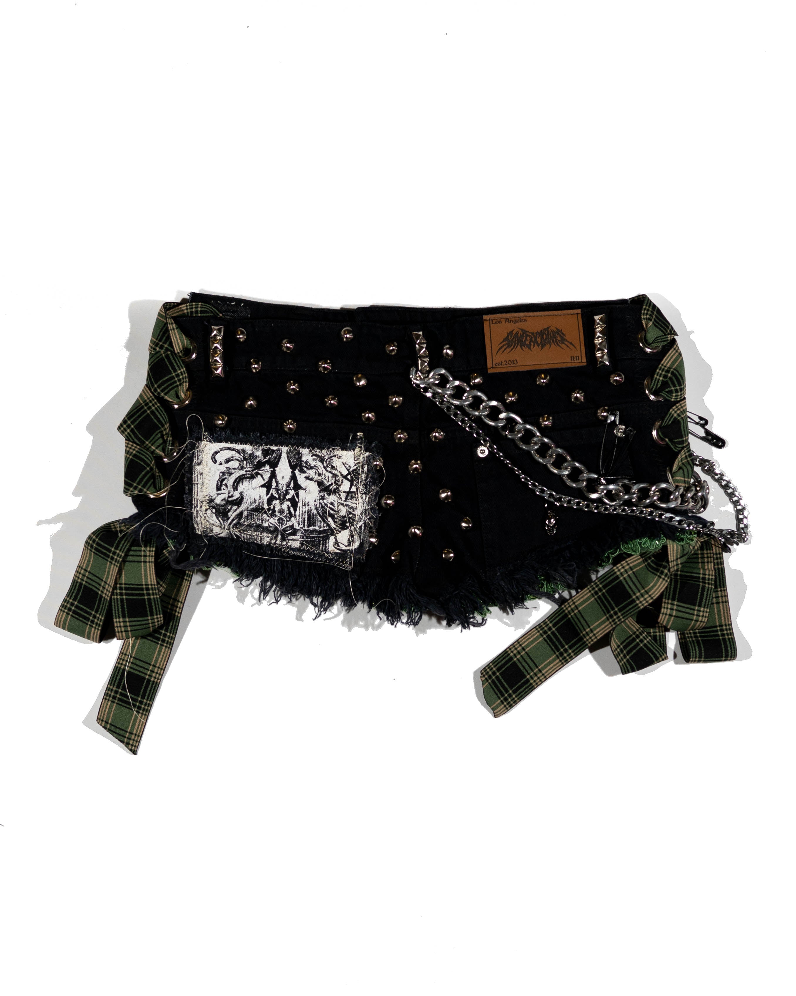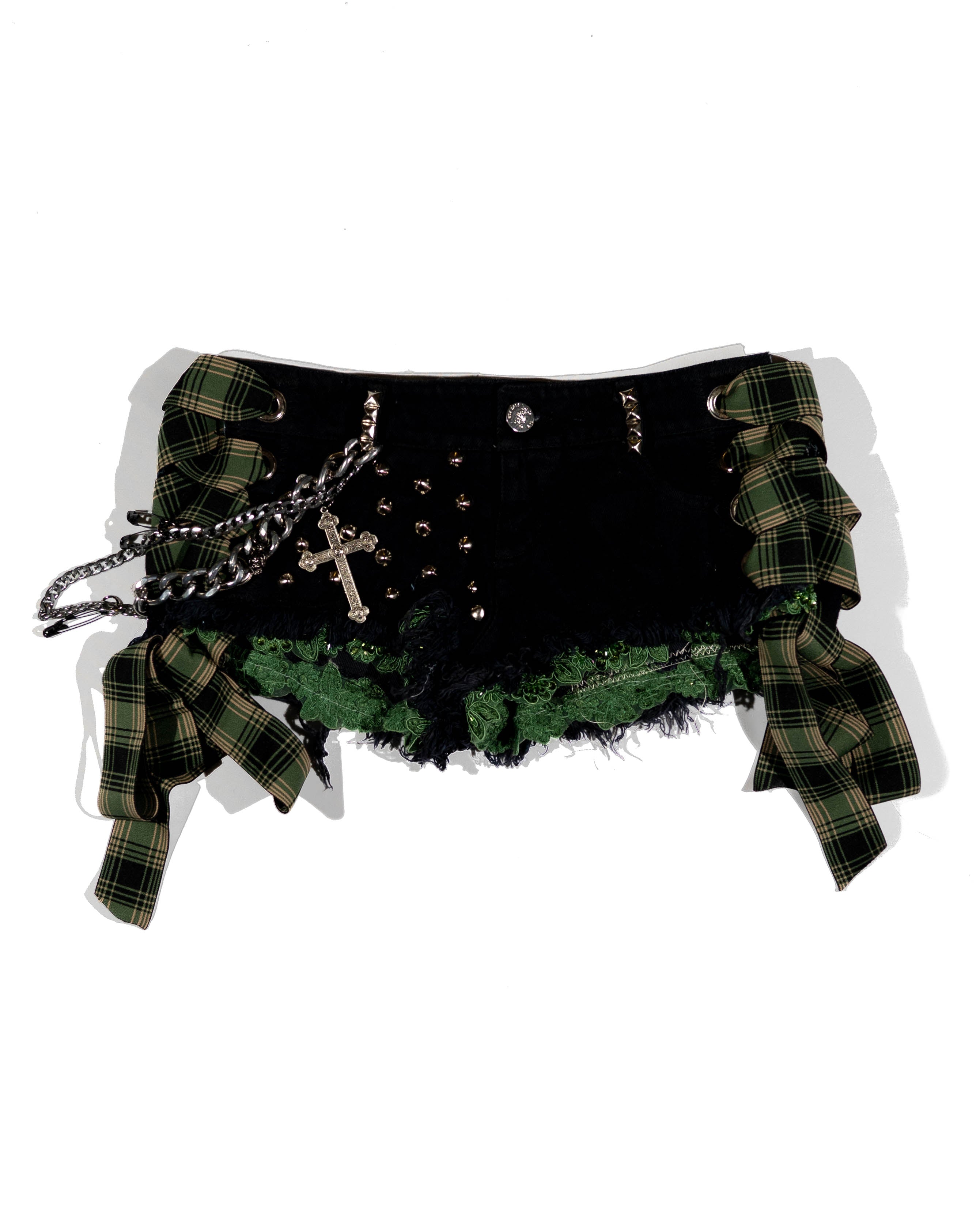Black jean shorts, Distressed wear and tear, Plant green plaid elastic ribbon on both sides of shorts, with SAYTEN silver eyelets. Silver Studs on front and back, jade green lace around both legs. Metal patch on back right with two silver chains wrapped around front to back. Jesus peace, safety pins, and black skull dangles.