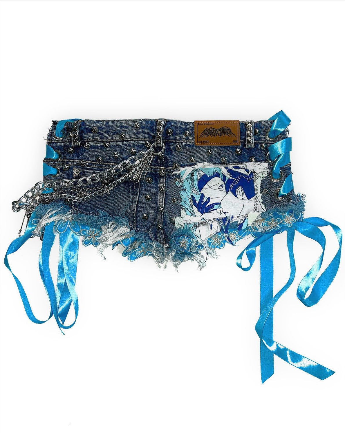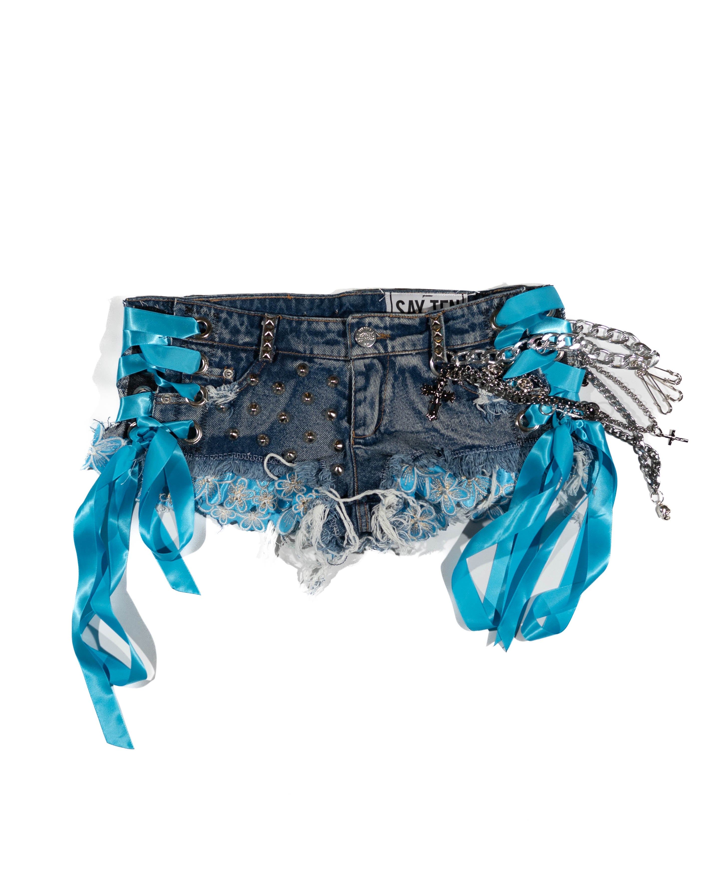 Blue denim shorts, Distressed wear and tear, Tiffany blue ribbon on both sides of shorts, with SAYTEN silver eyelets. Silver Studs on front and back, Sky blue floral lace around both legs and right side iiii"s pocket patch. Three different silver chain wrapped around front to back with safety pins, crosses and silver skull dangles.