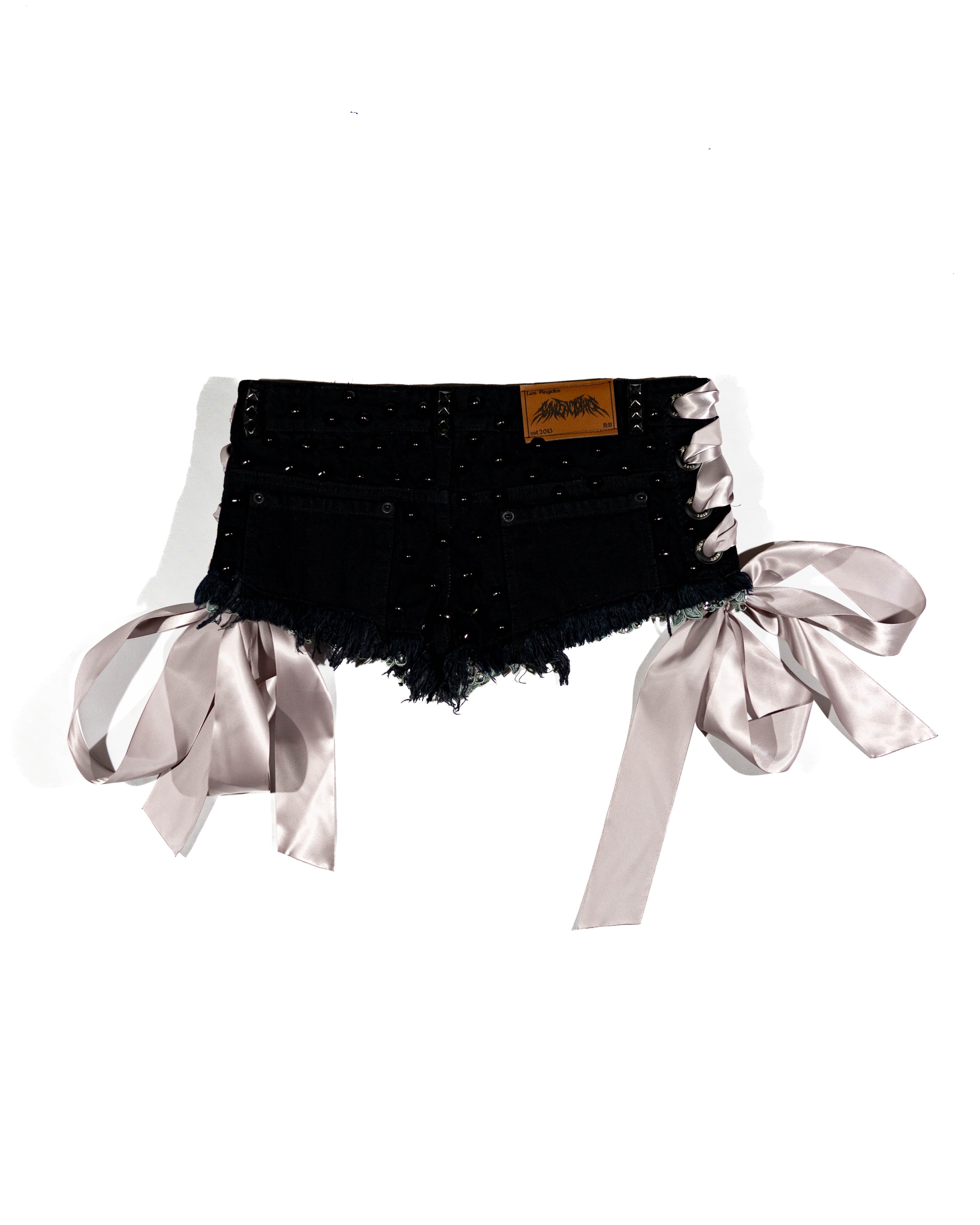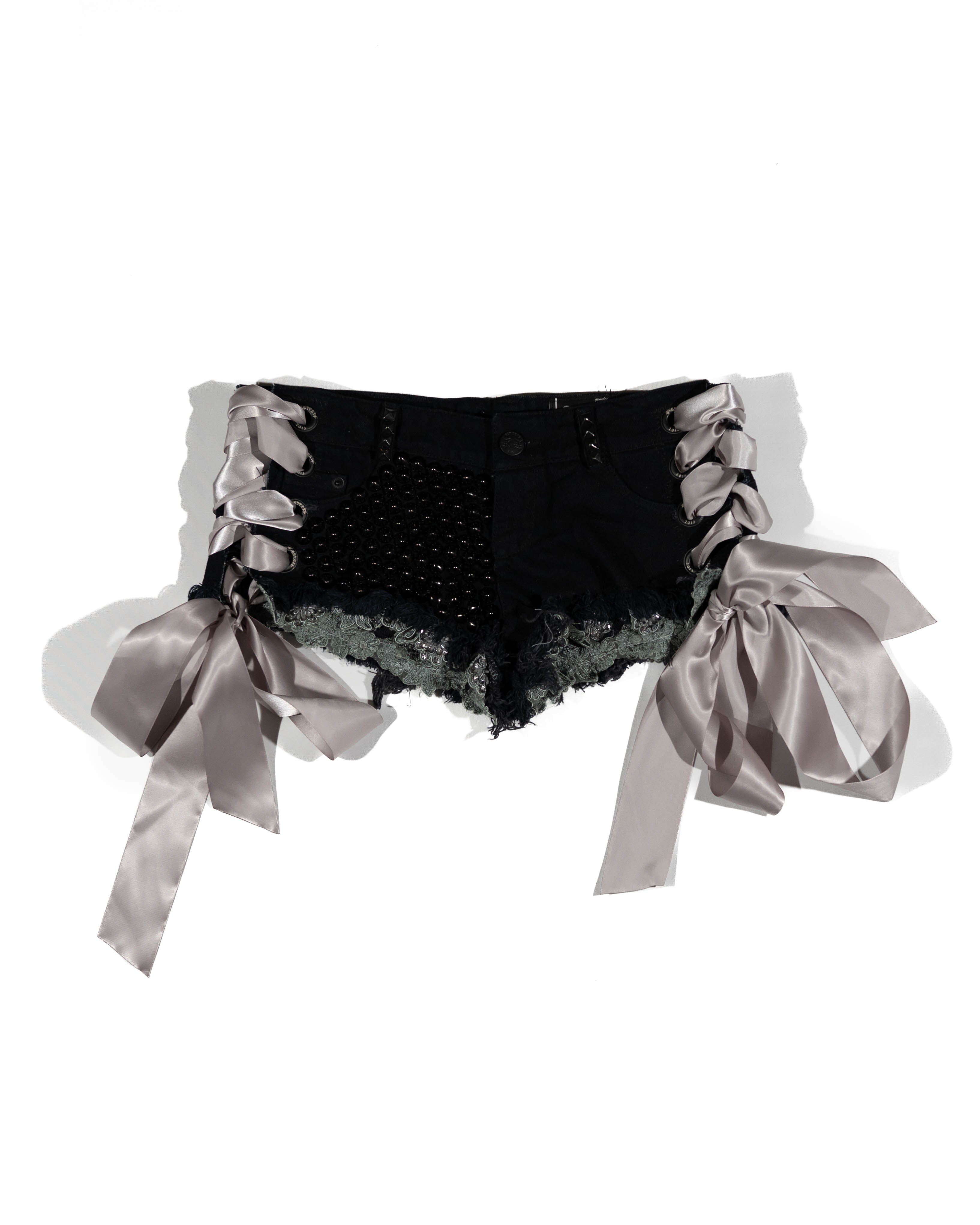 Black denim shorts, Distressed wear and tear, Old Gray ribbon on both sides of shorts, with SAYTEN black eyelets. Black Studs on front and back, metal gray lace around both legs.