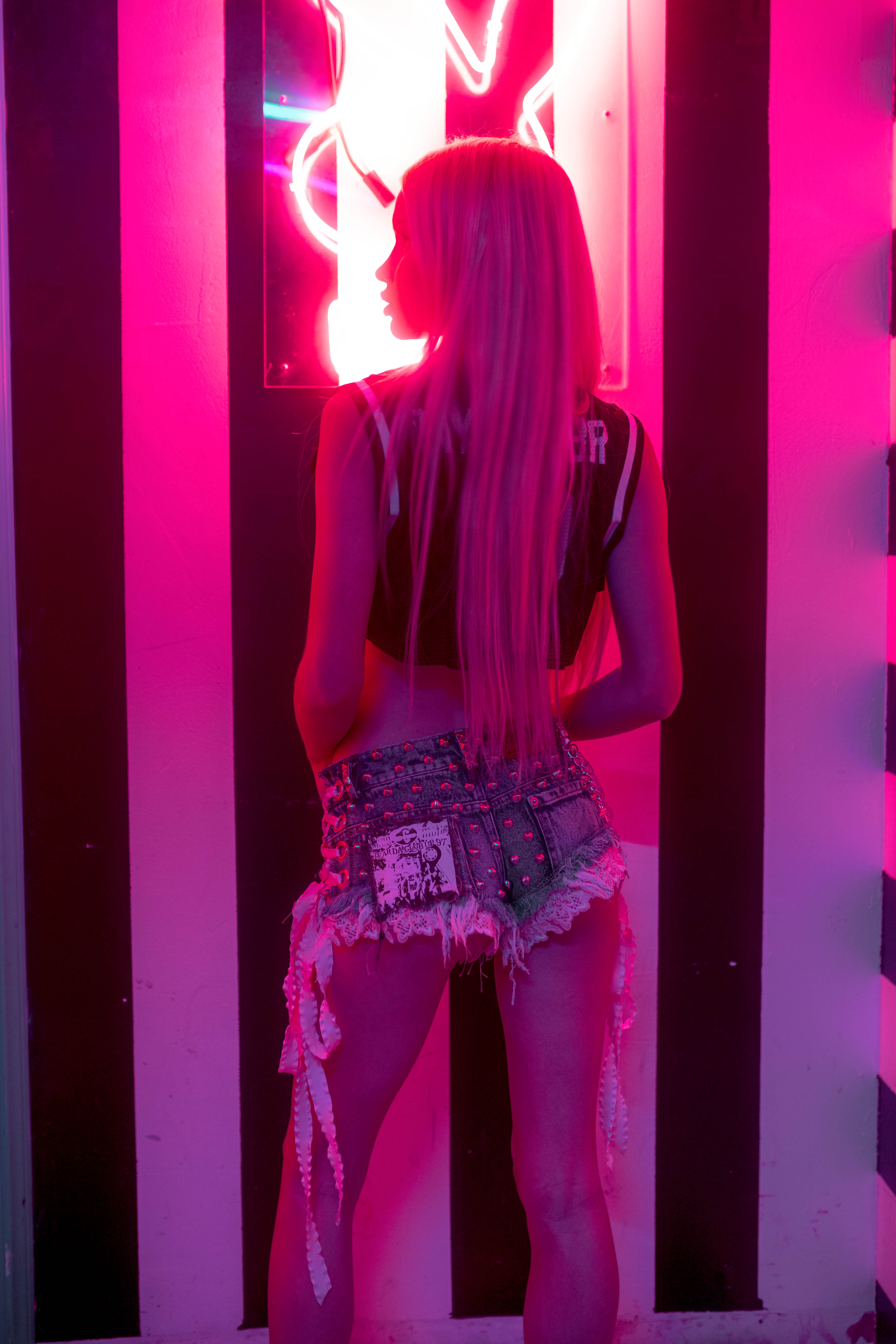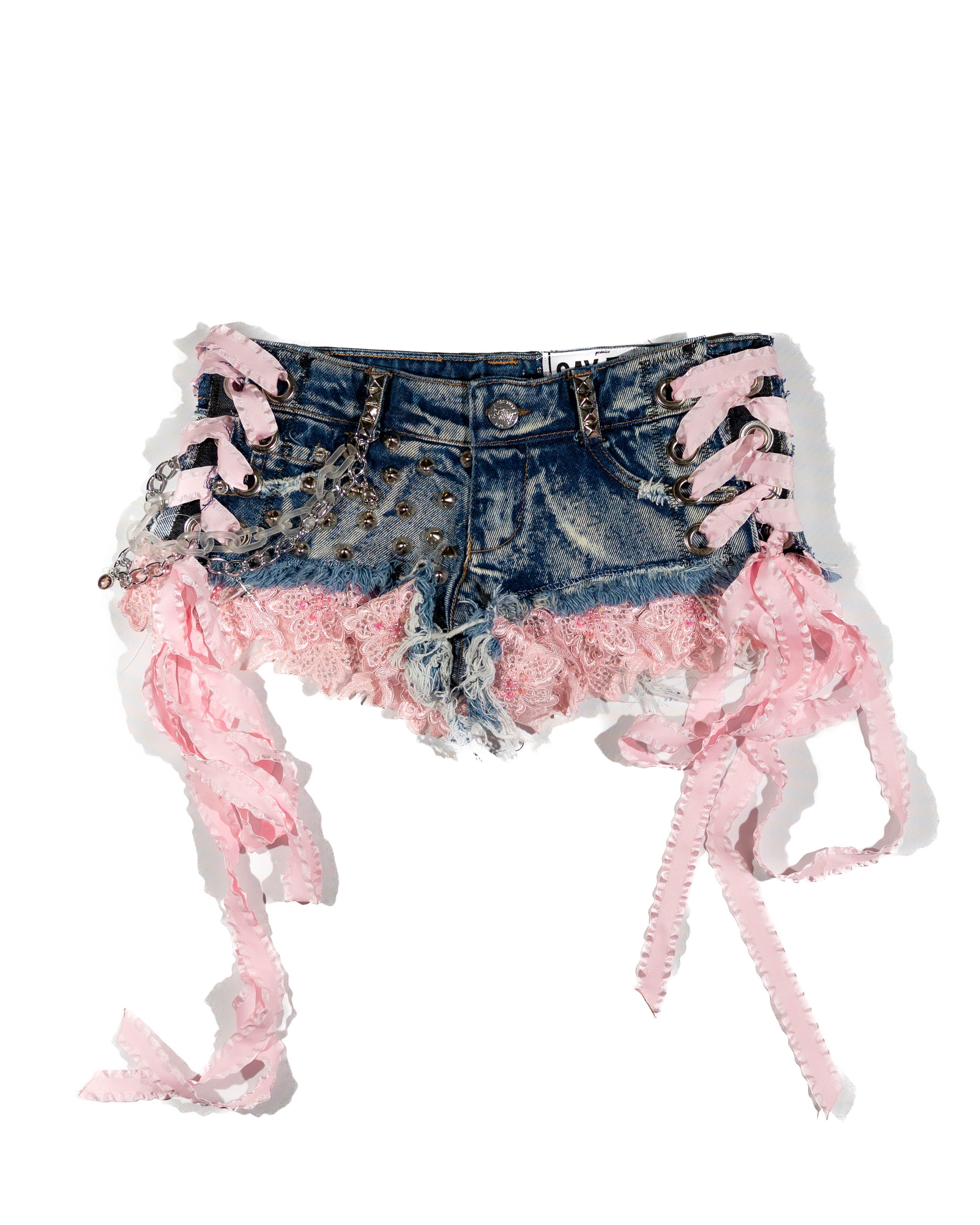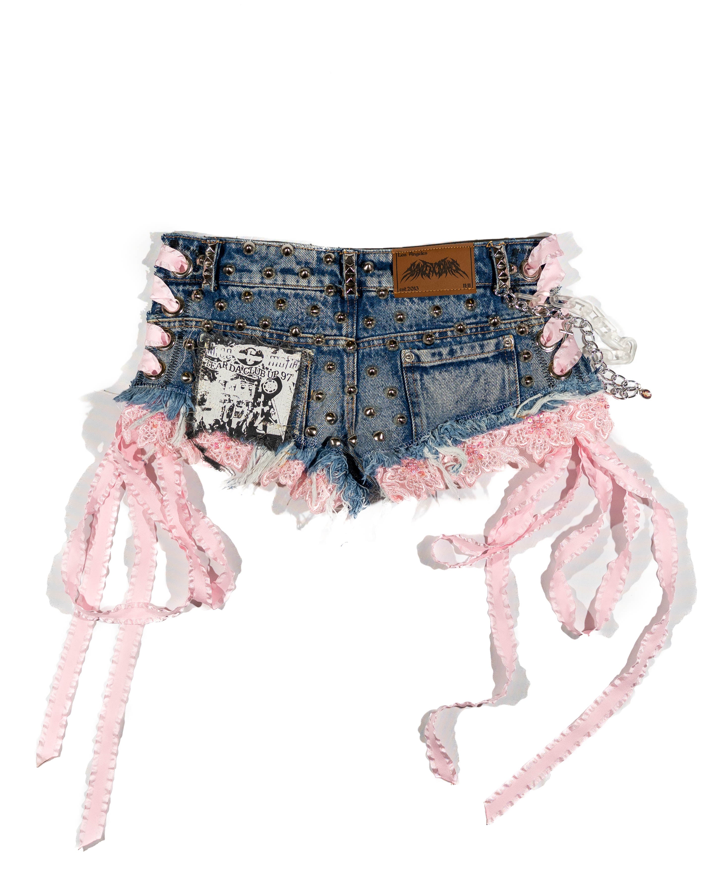 Blue denim jean shorts, Distressed wear and tear, Da'Baby pink ribbon on both sides of shorts, with SAYTEN silver eyelets. Silver Studs on front and back, Peep Pink lace around both legs. Three-six-mafia patch on back right with one clear chain and one silver chain wrapped around front to back. Jesus peace, and silver crosse's dangles.