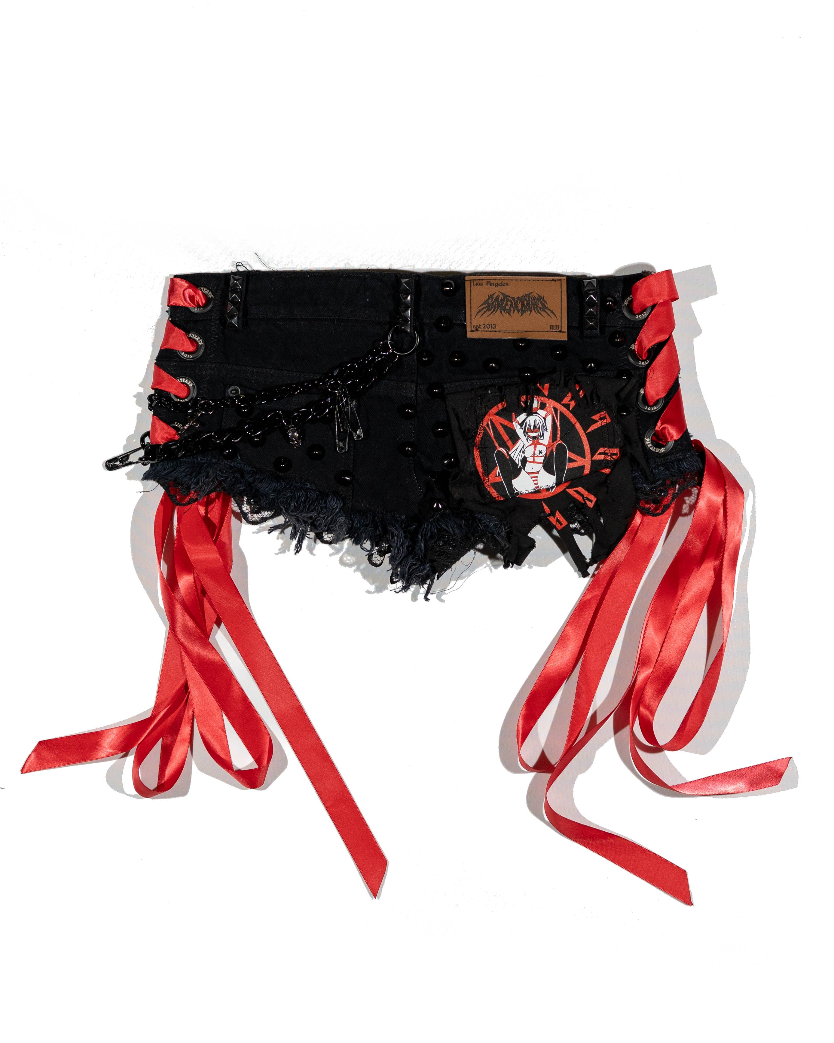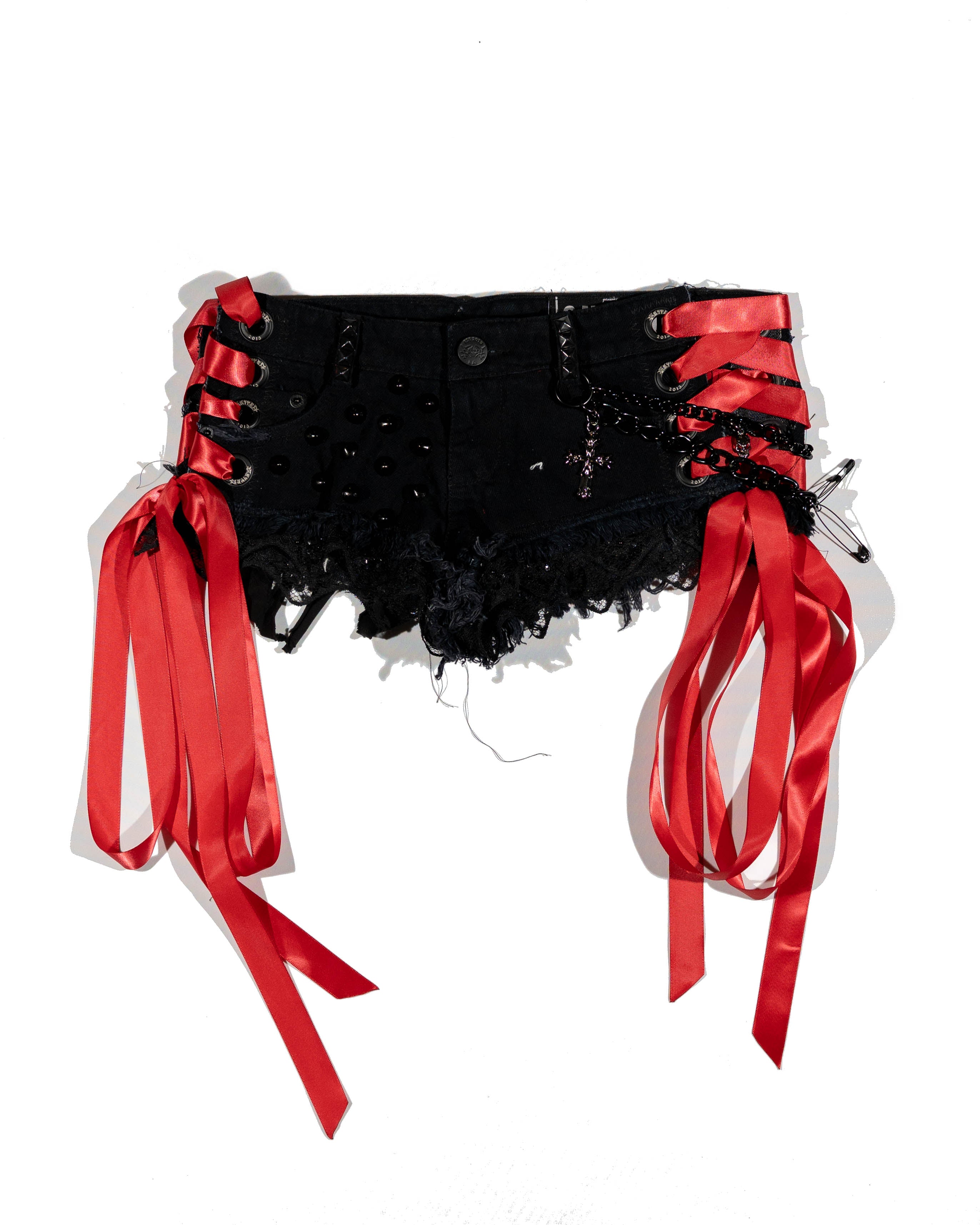 Black denim jean shorts, Distressed wear and tear, Rose Red ribbon on both sides of shorts, with SAYTEN black eyelets. black Studs on front and back, ghotham black lace around both legs. 4 iiii's patch on back right pocket with two black chains wrapped around front to back. Jesus peace, safety pins and black crosse's dangles.