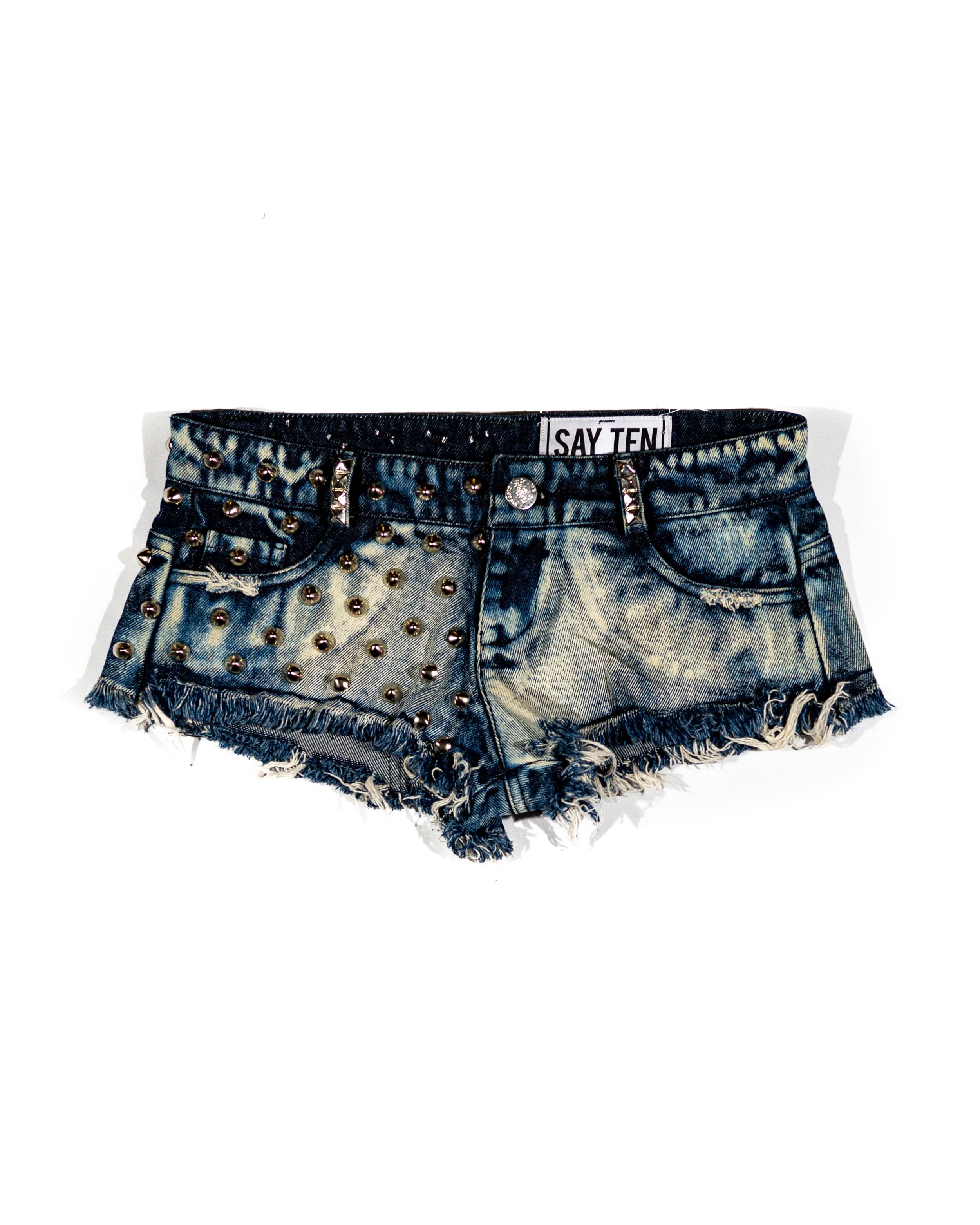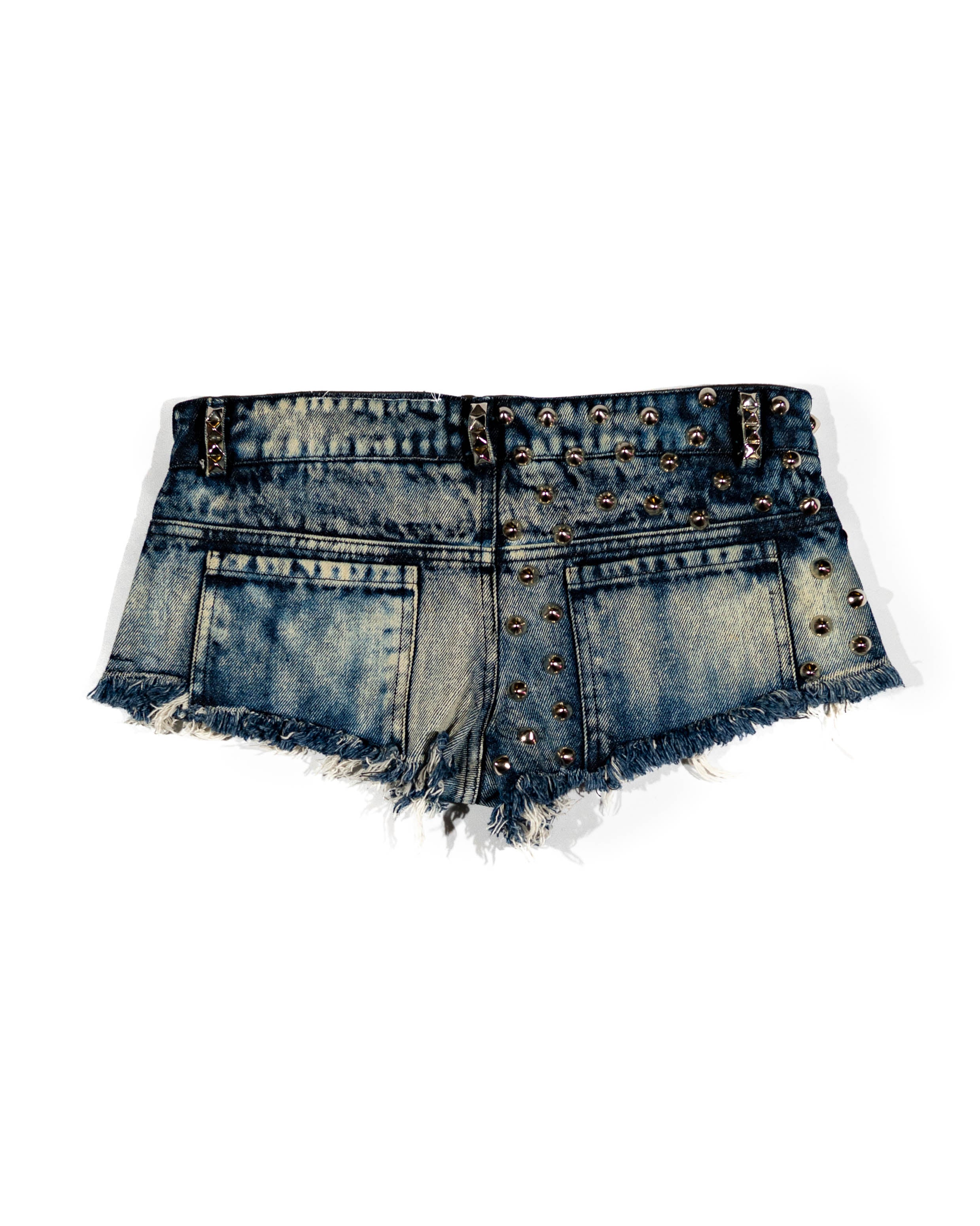 Blue denim shorts, Distressed wear and tear, silver studs on front and back. one and only par to be made this way in a size medium. basic AF