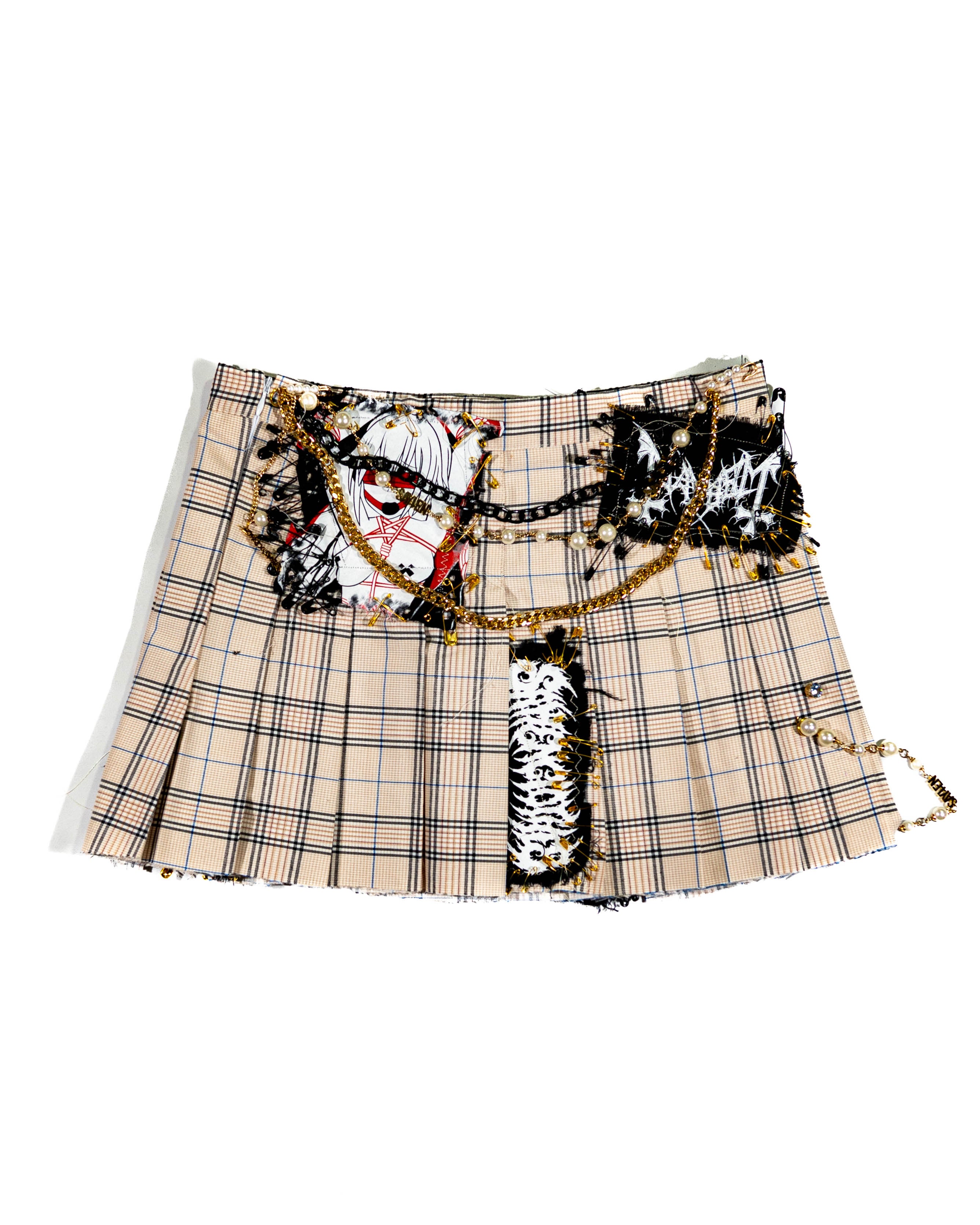 Cream plaid pleated skirt, with three SAYTENCLOTHES patches. One MAYHEM and two 4-iiii's patches. All patches encompassed with safety pins. Three chains on the front w/ safety pin's, black skulls, small cross dangles. Side dangle chain left leg. Unique gold chains w/ white pearls & SAYTEN logo. Black & gold safety pins.