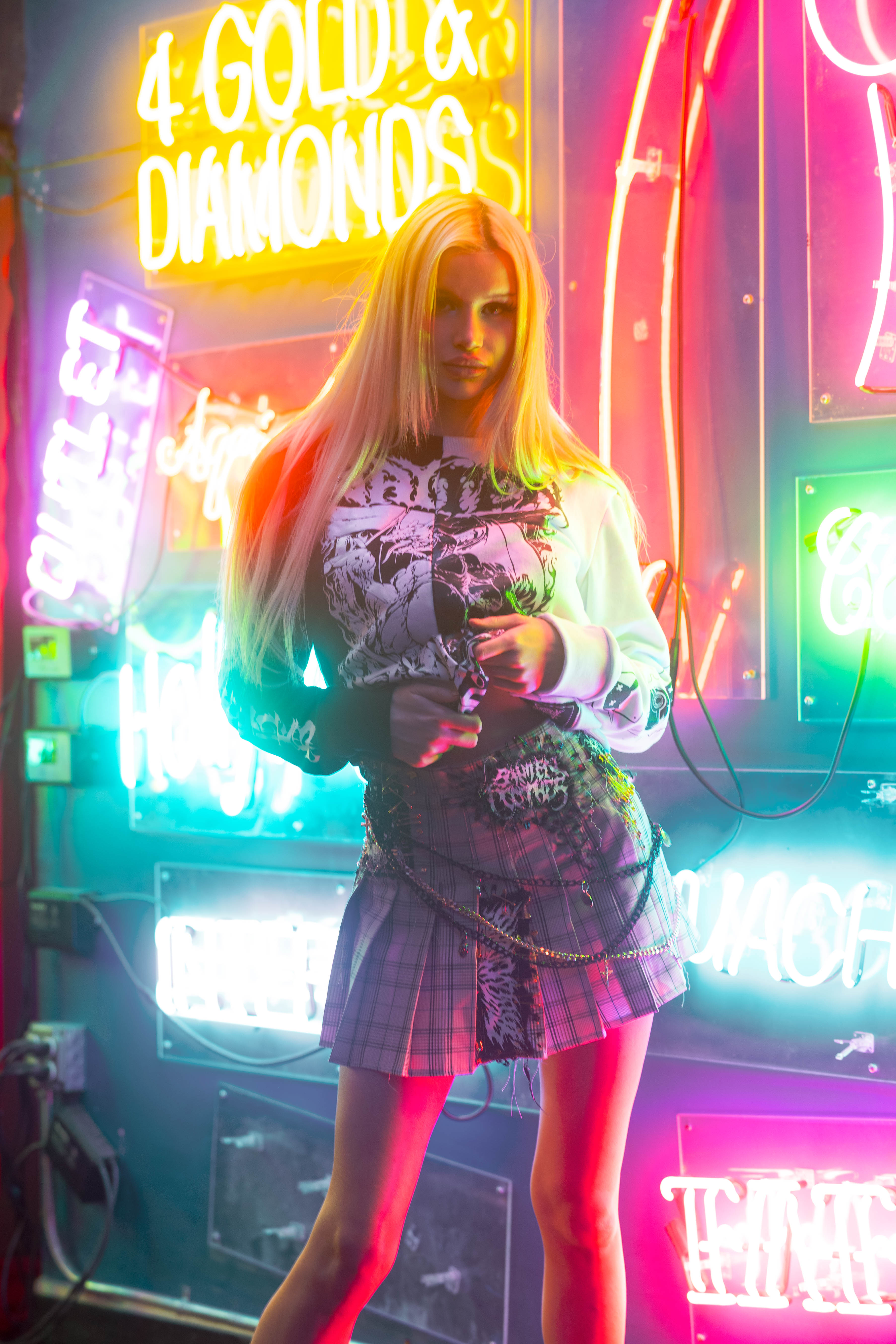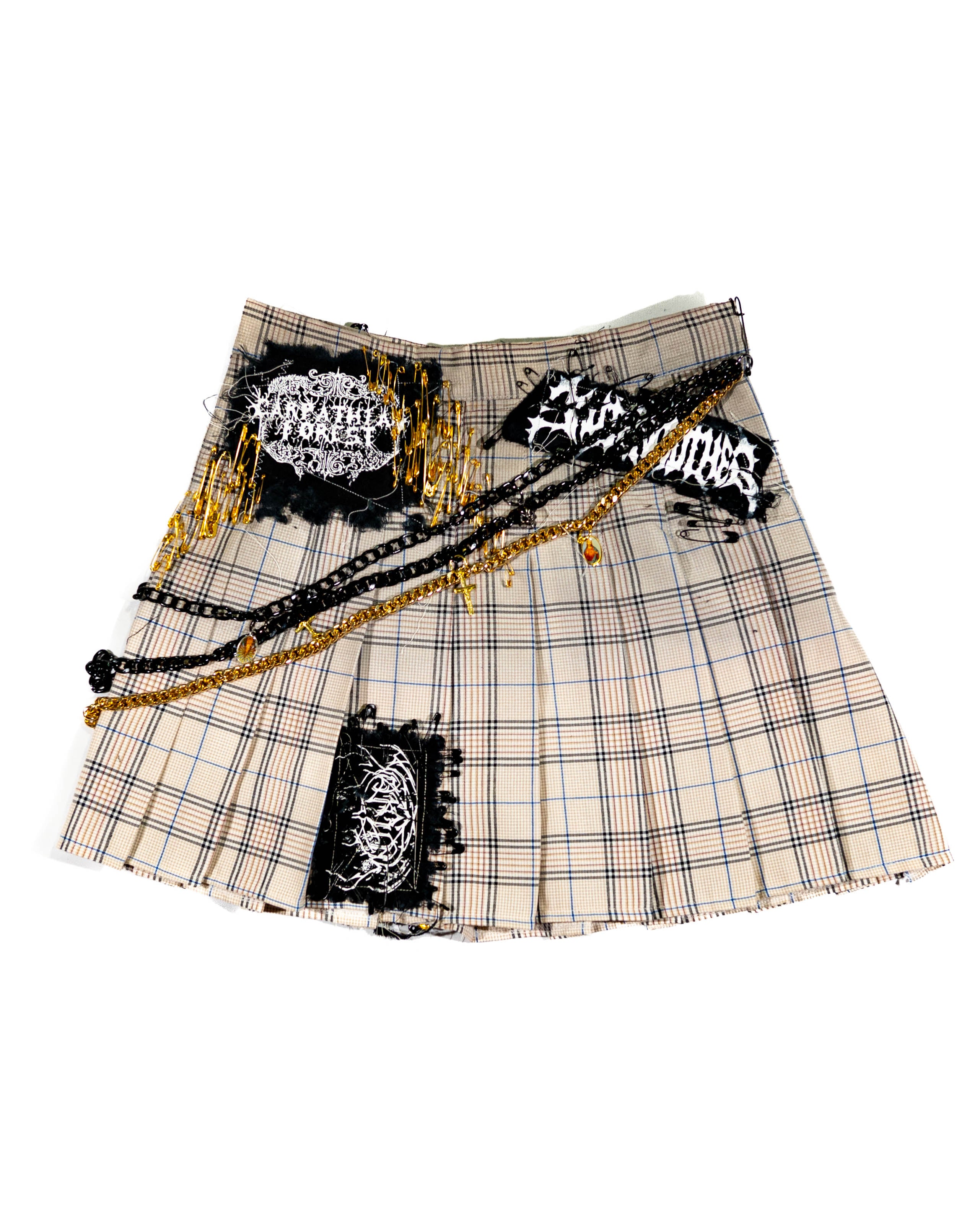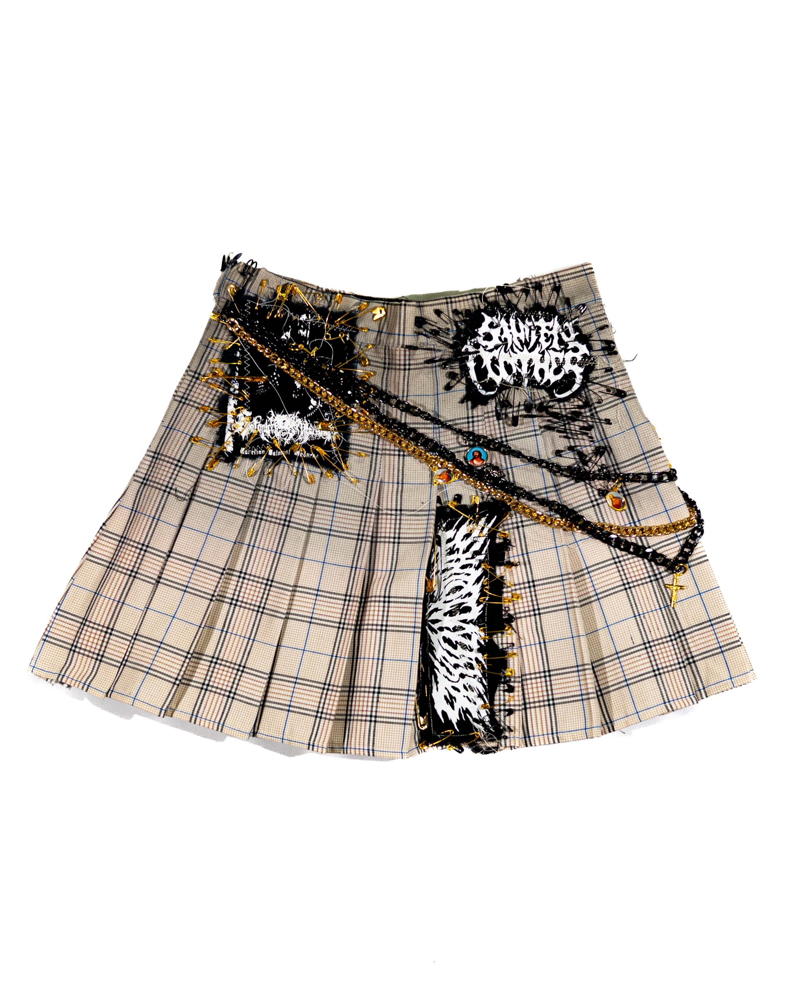 Cream plaid pleated skirt, with three SAYTENCLOTHES patches. Three DEATHCORE METAL patches. All patches encompassed with safety pins. Three chains diagonal across front to back w/ safety pin's, black skull, jesus piece, small cross dangles. Black & gold safety pins.