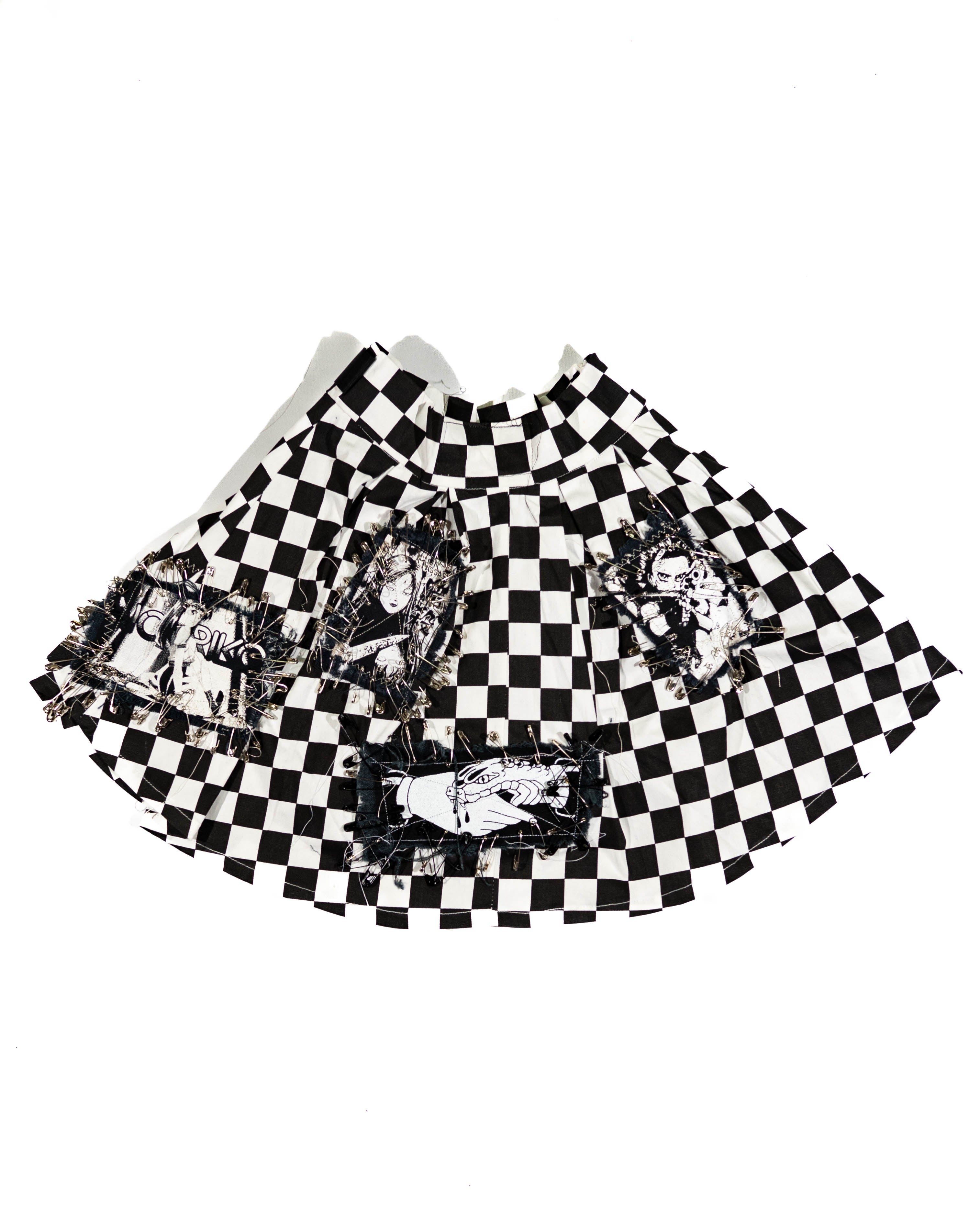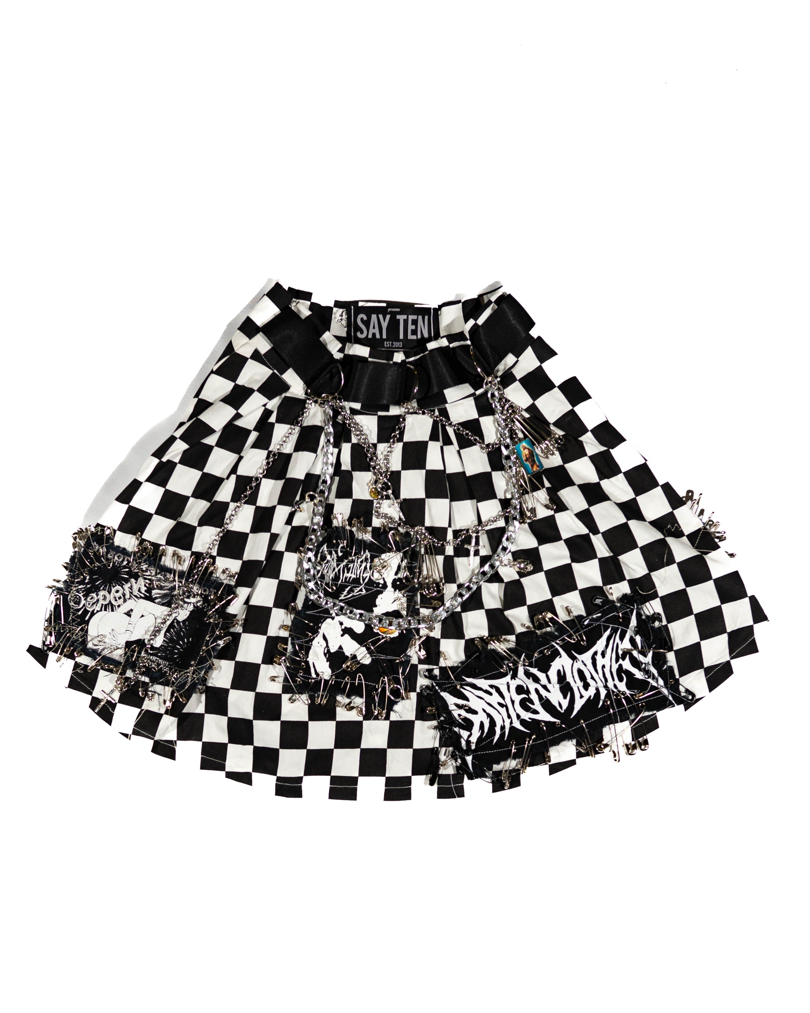 black & white checkered skirt, with one SAYTENCLOTHES patches. Fore anemia patches and two death metal patches encompassed with silver safety pins. 2 different chains diagonal across front to back with safety pin's, black skull, small cross dangles.