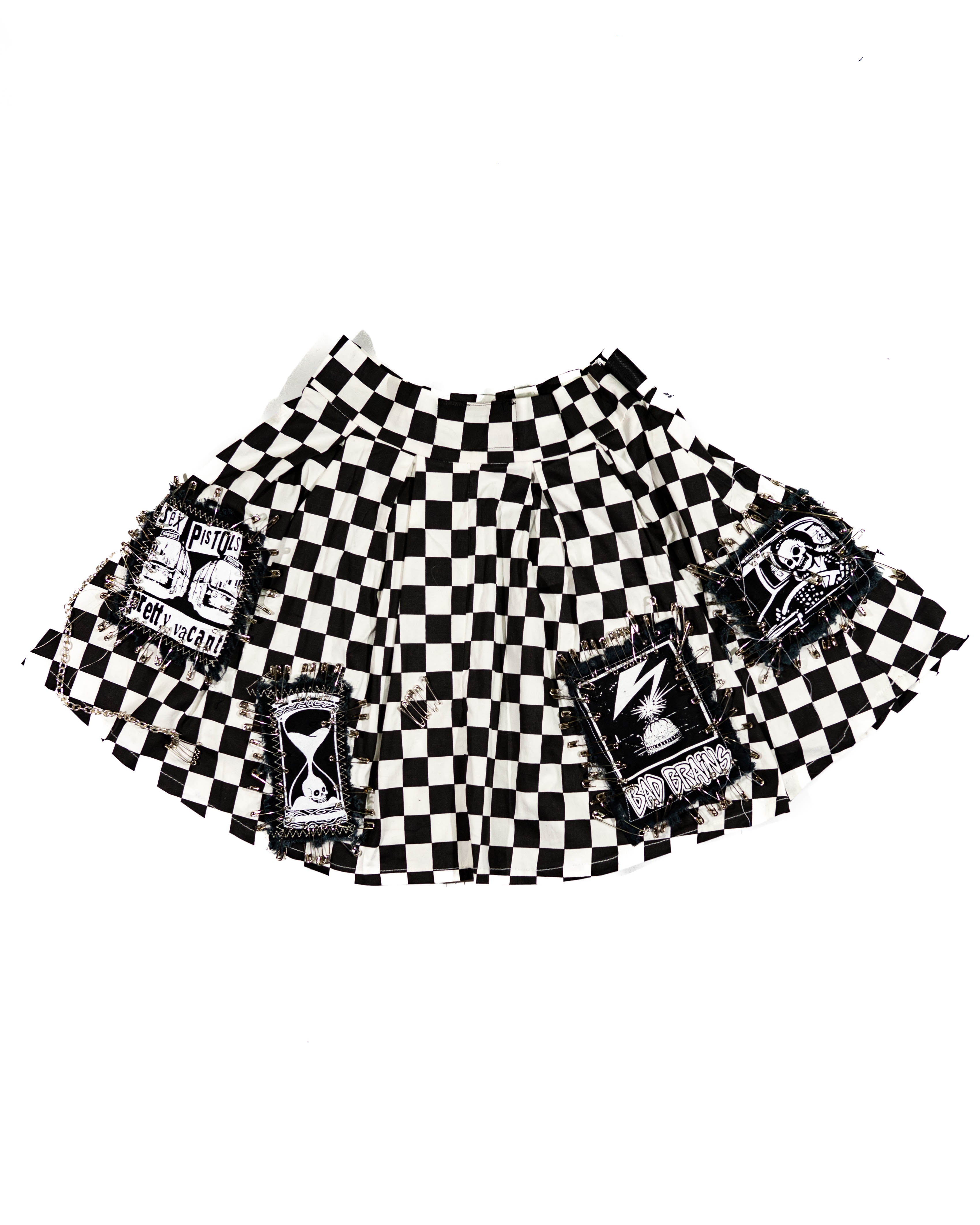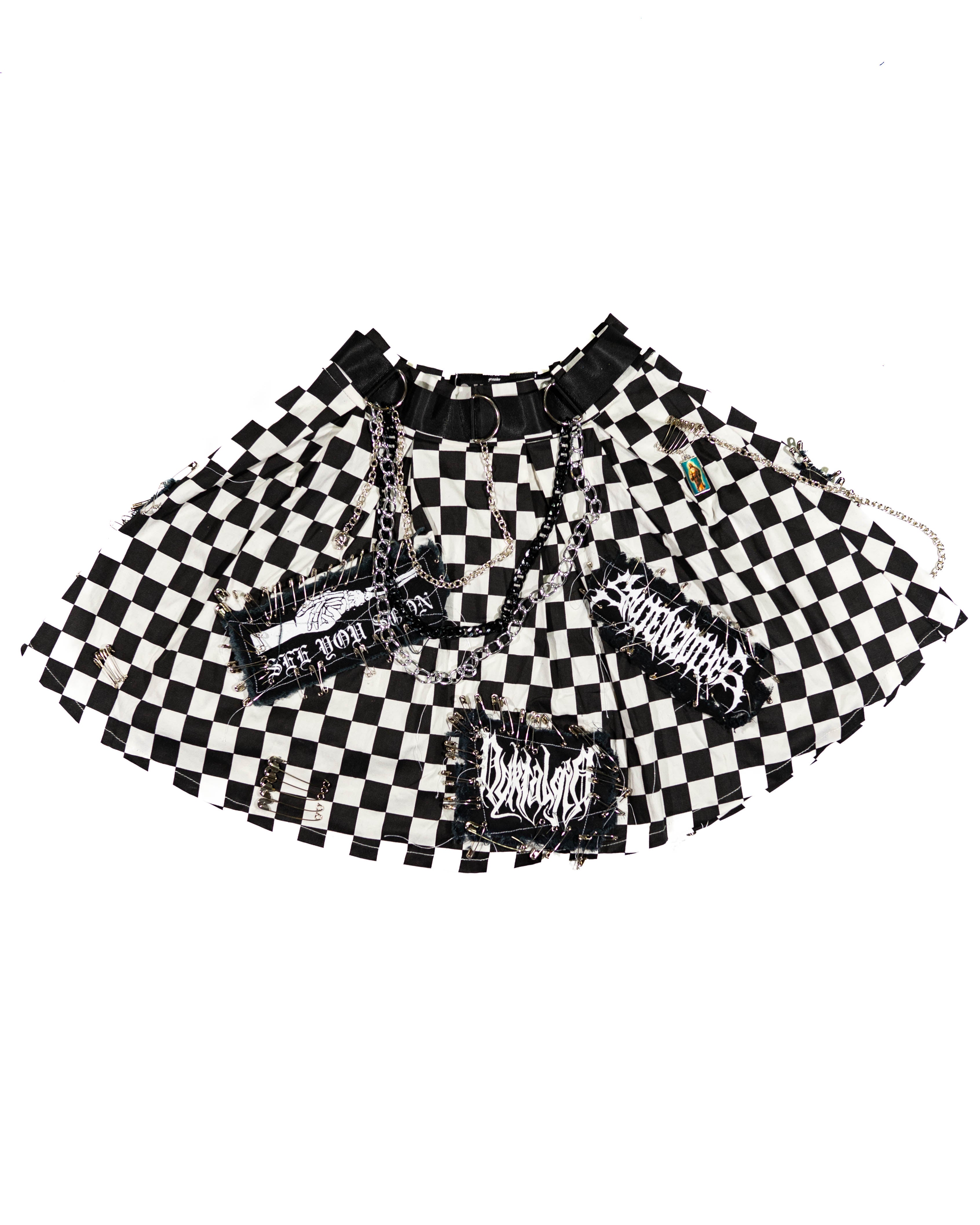 black & white checkered skirt, with one SAYTENCLOTHES patches, one bad brains patch, three skull patches, one sex pistols patch and two death metal patches encompassed with silver safety pins. Two different black and silver chains diagonal across the front. One silver side chain diagonal around the bottom right side to the back to back with silver skull diagonals.