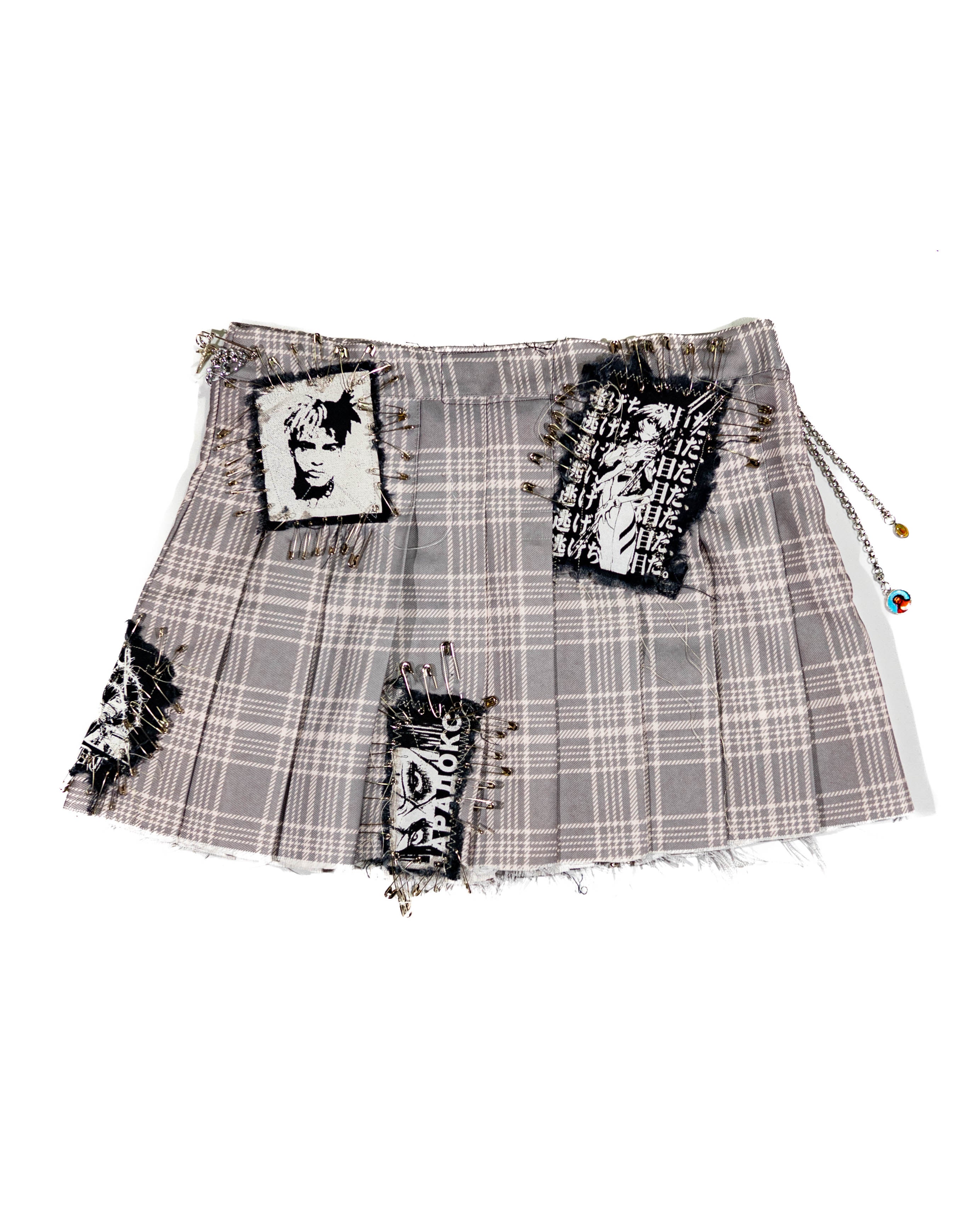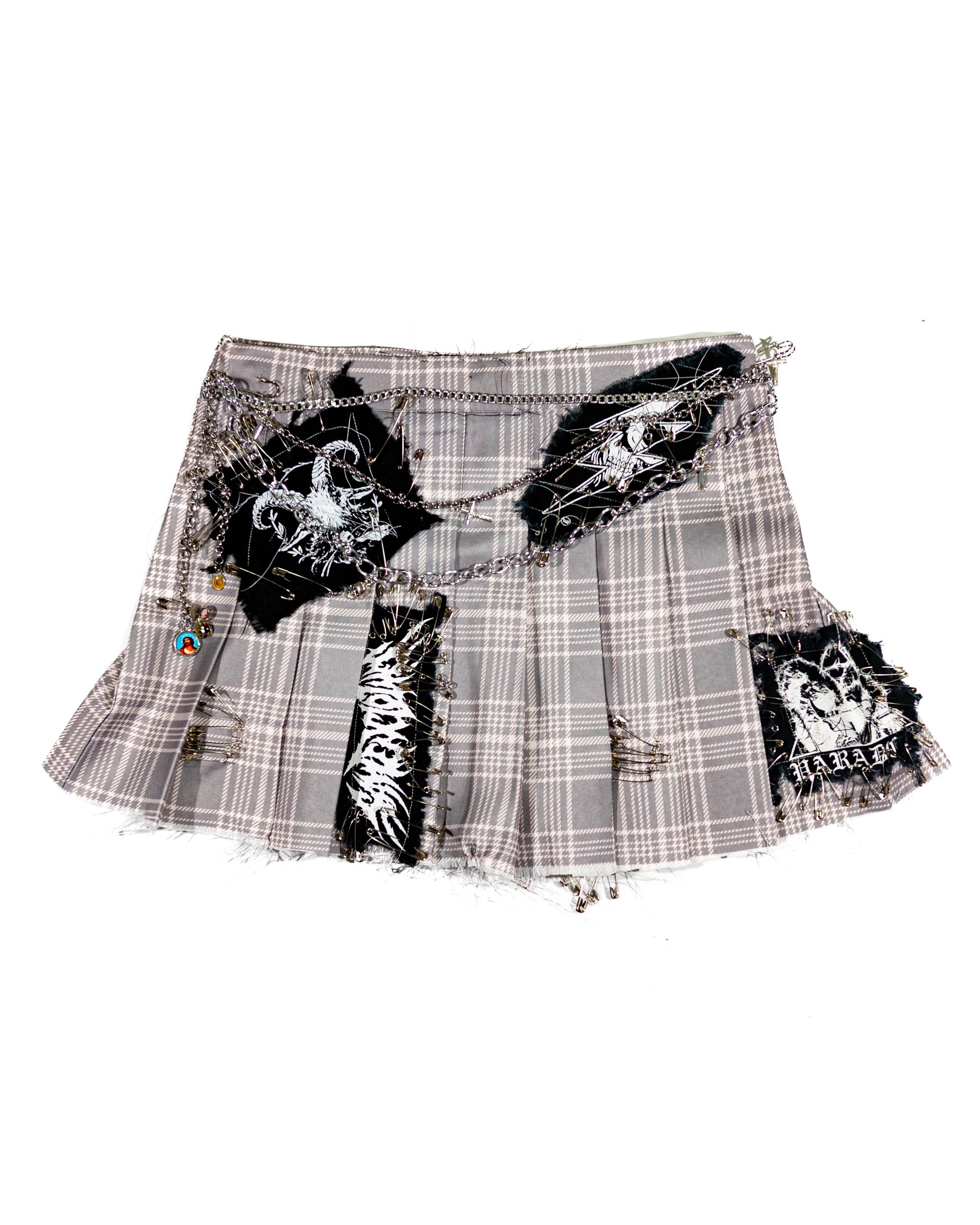 Grey frayed plaid pleated skirt, with one SAYTENCLOTHES patch. Three ANIME, one XXXTENTACION, two METAL patches. All patches encompassed with safety pins. Three chains on the front w/ safety pin's, silver skulls, small cross dangles. Two side dangle chains w/ jesus pieces. All silver safety pins.